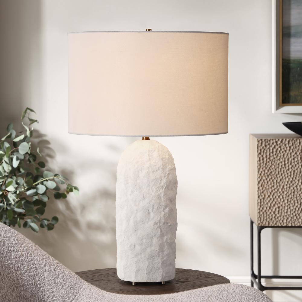 The Vieste Table Lamp Is Elegantly Poised And Organically Textured With A White Sandstone Base, This Piece Exudes Sophistication With Plated Brushed Antique Brass Finishes. The Round Hardback Shade Is Covered In A Crisp White Linen Fabric.