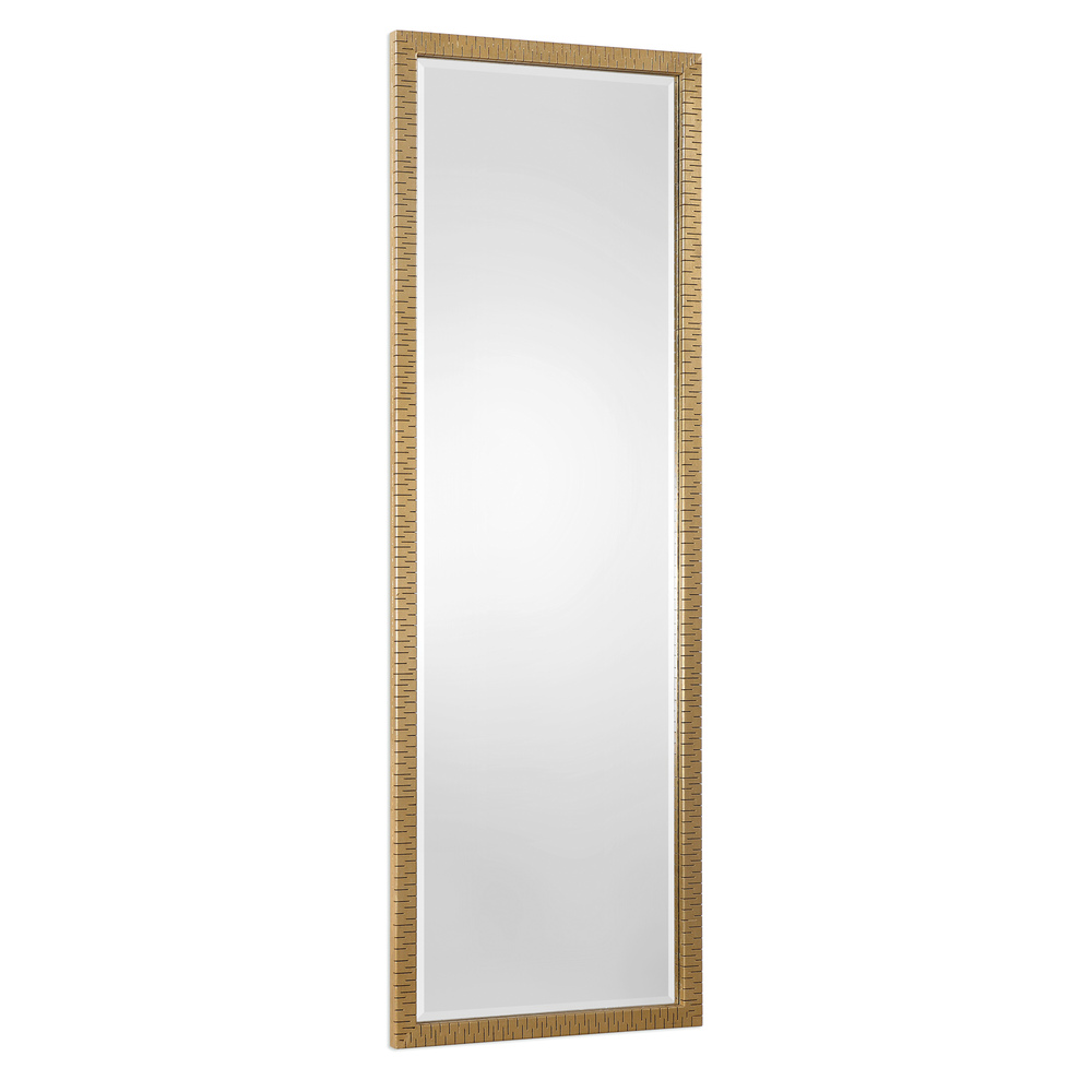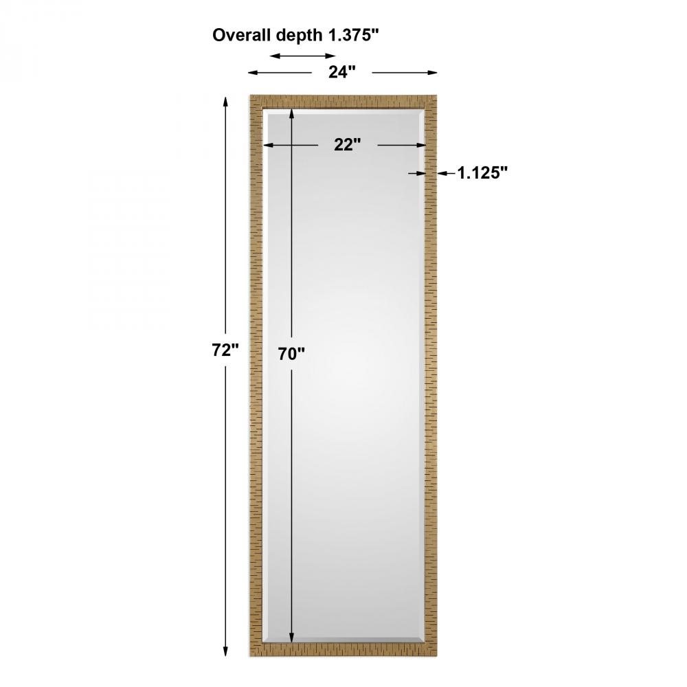 Thick Iron Frame Featuring Alternating Laser Cut Grooves, Finished in A Lightly Antiqued, Metallic Gold Leaf. Mirror Has A Generous 1 1/4" Bevel and May Be Hung Horizontal or Vertical.