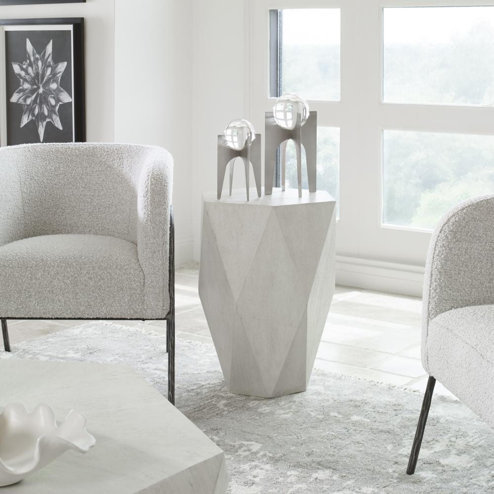 This Unique Geometric Side Table Features A Sunburst Top in Mango Veneer in A Fresh White Ceruse Finish.