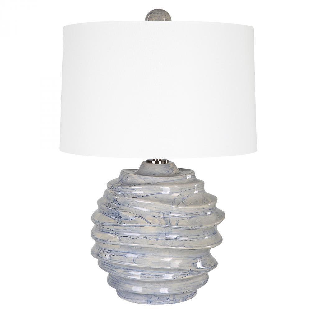 A Contemporary Take on Classic Blue and White Ceramics, This Ceramic Lamp Features A Unique Sculpted Design with A Hand Applied Light Cobalt Blue Drip Glaze and A Oversized Matching Ceramic Finial. The Table Lamp is Paired with A Crisp White Hardback Drum Shade.