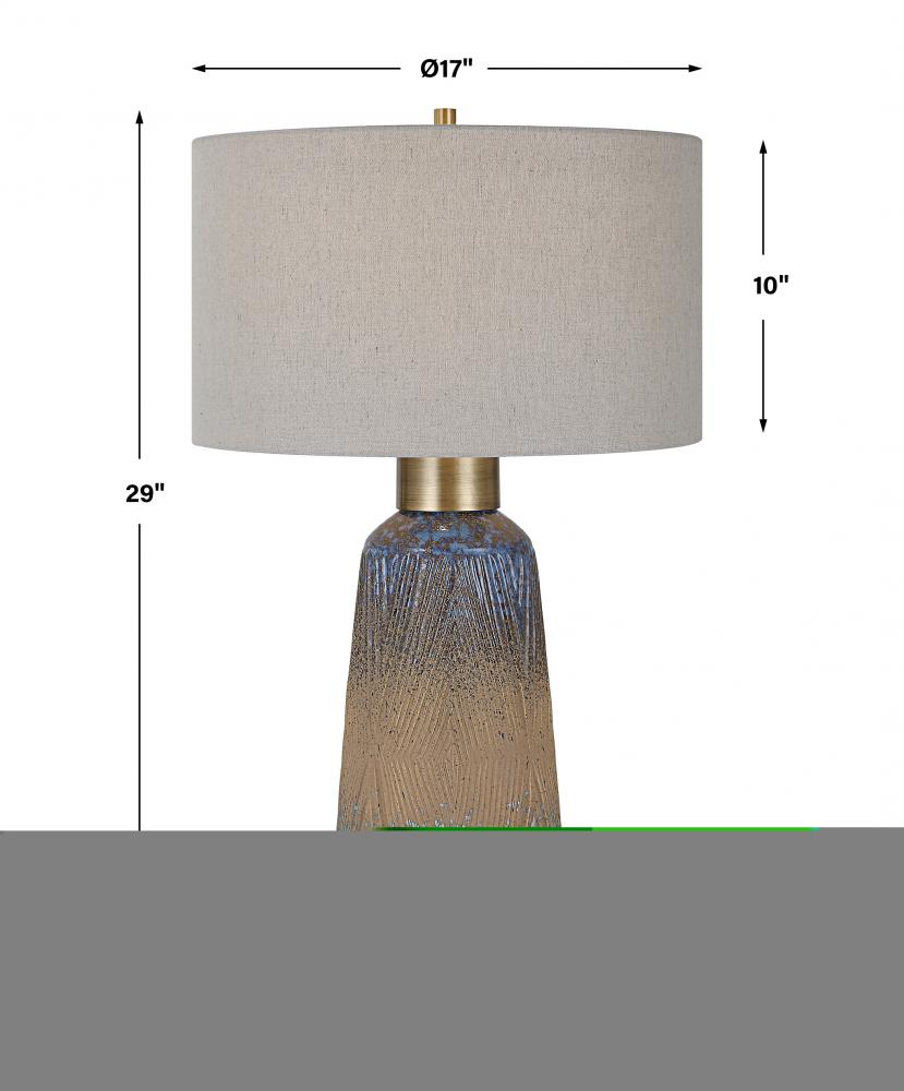 A Beautiful Display of Color and Style, This Ceramic Table Lamp Features An Embossed Design with A Unique Mix of Matte and Gloss Glazes in Various Shades of Blue-green, Indigo, and Golden Rust, Paired with Antique Brass Plated Details. The Hardback Drum Shade is Covered in A Light Gray Linen Fabric with Natural Slubbing.