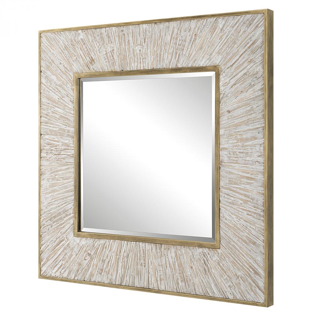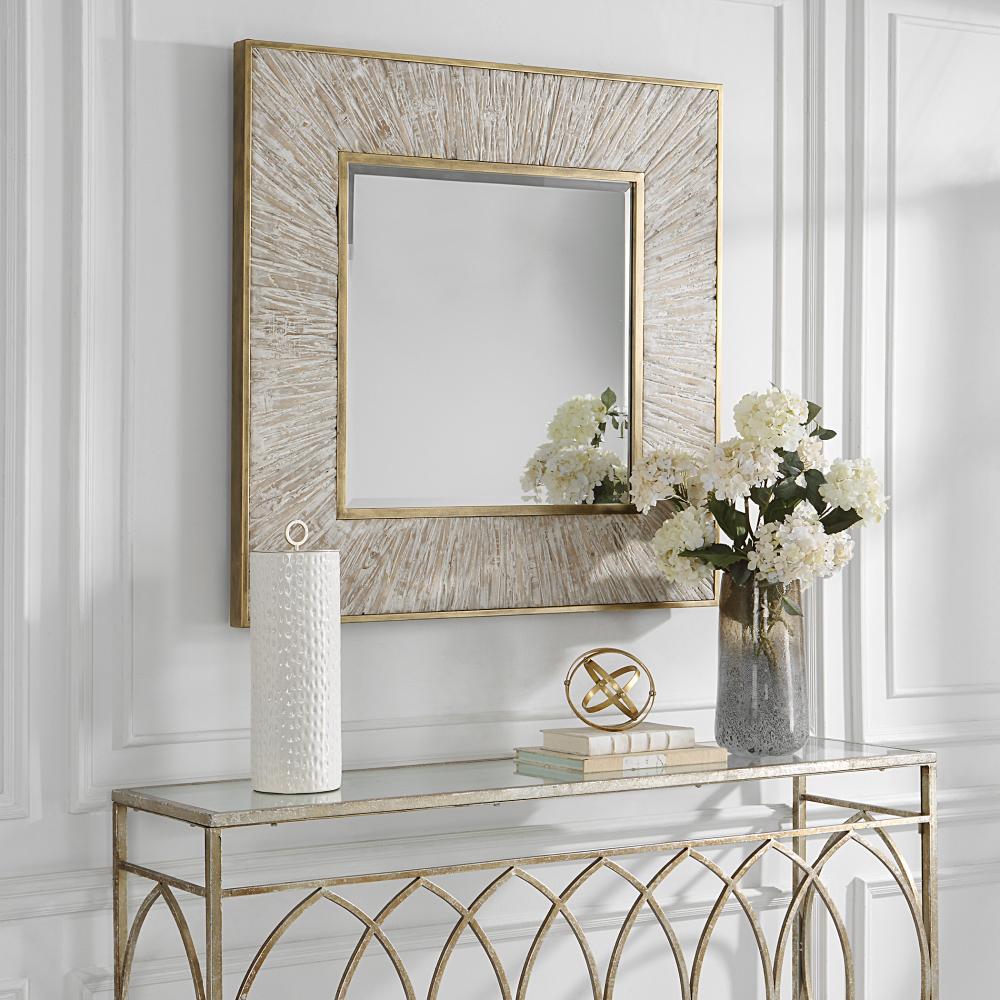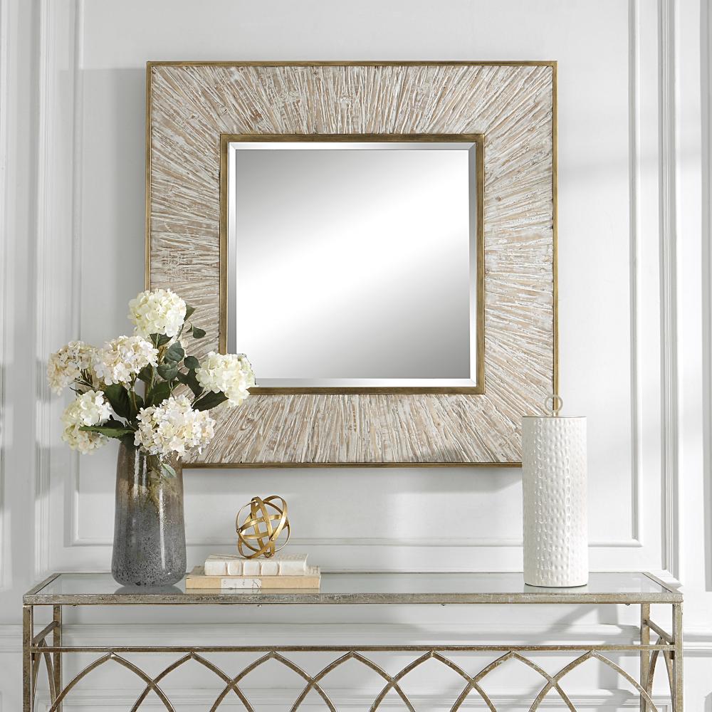 Rustic with A Twist, This Square Mirror is Constructed From Solid Wood in A Heavily Distressed Finish with Aged Whitewash. Iron Details Are Finished in Aged Gold. The Mirror Features A Generous 1 1/4" Bevel.