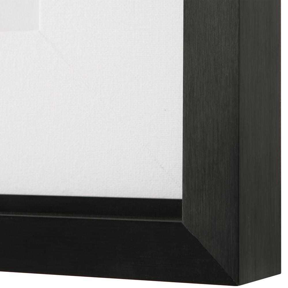 These Contemporary Compositions Feature A Unique Combination of Warm Golden Ochre, Deep Charcoal, and White Tones. Accented By Satin Black Pine Wood Frames and A Natural Linen Wrapped Mat. May Be Hung Horizontal or Vertical. Printed on Paper with Special Matte Finish. Artwork By Joyce Combs.