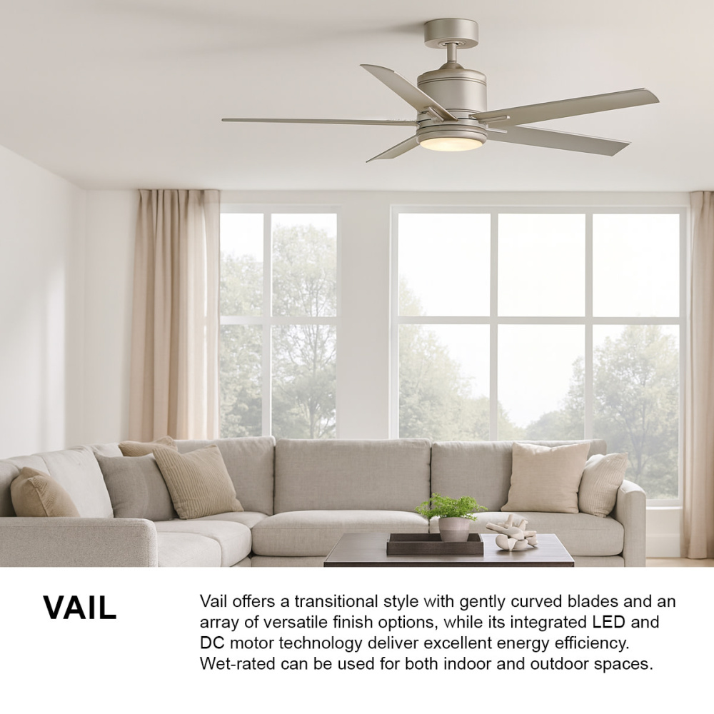 As a smaller companion to Vantage, Vail offers a transitional design with gently curved blades and an array of finish options, while its integrated LED lighting and DC motor technology deliver excellent energy efficiency. Vail is so versatile; it can be used for both indoor and outdoor spaces. Blades are included with every fan.