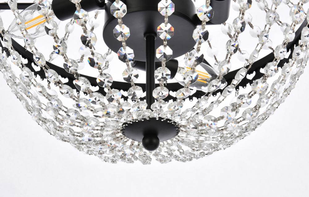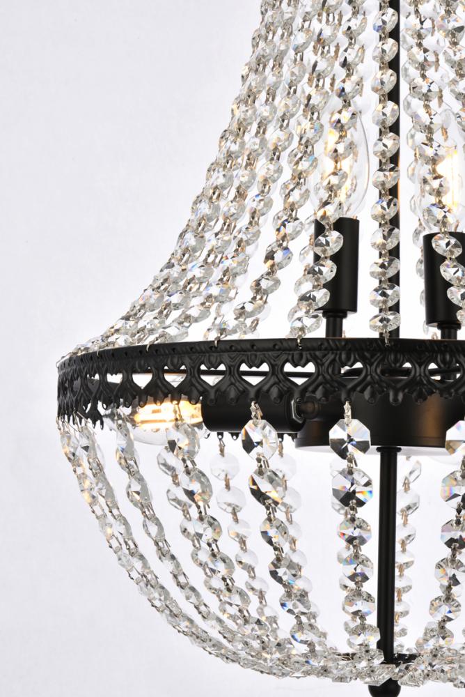 Tiers of clear multi-faceted crystals reflect the soft glow of candelabra bulbs