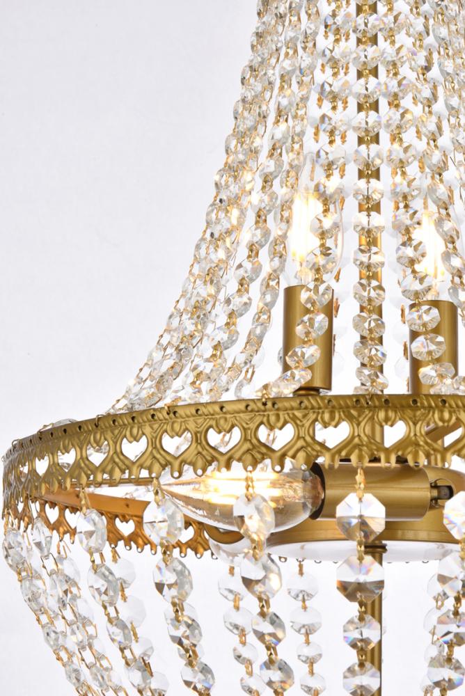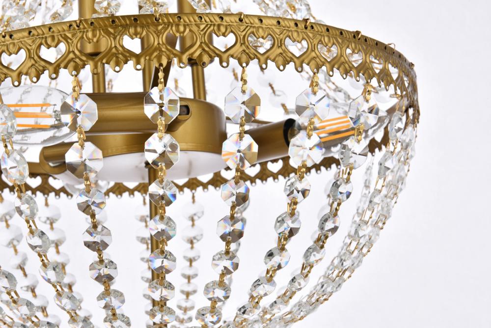 Tiers of clear multi-faceted crystals reflect the soft glow of candelabra bulbs