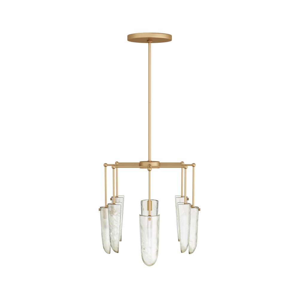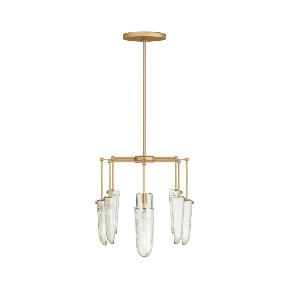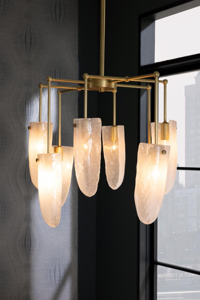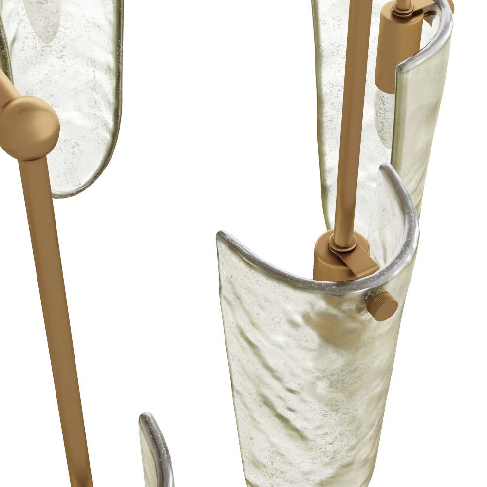 OUR LUXE VALERIA CHANDELIER IS FASHIONED IN CLEAR SEEDY GLASS, WITH A DELICATE, OVAL PIPE FRAMEWORK IN ANTIQUE BRASS IRON. LIKE GLISTENING WATER DROPLETS, SHIELD-SHAPED SHADES CASCADE FROM EACH ARM, CASTING WARM AMBIENT LIGHT AS IT PASSES THROUGH THE TEXTURED GLASS. FINISH WILL VARY.