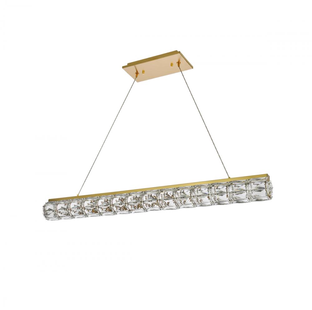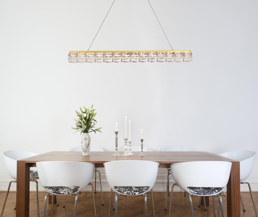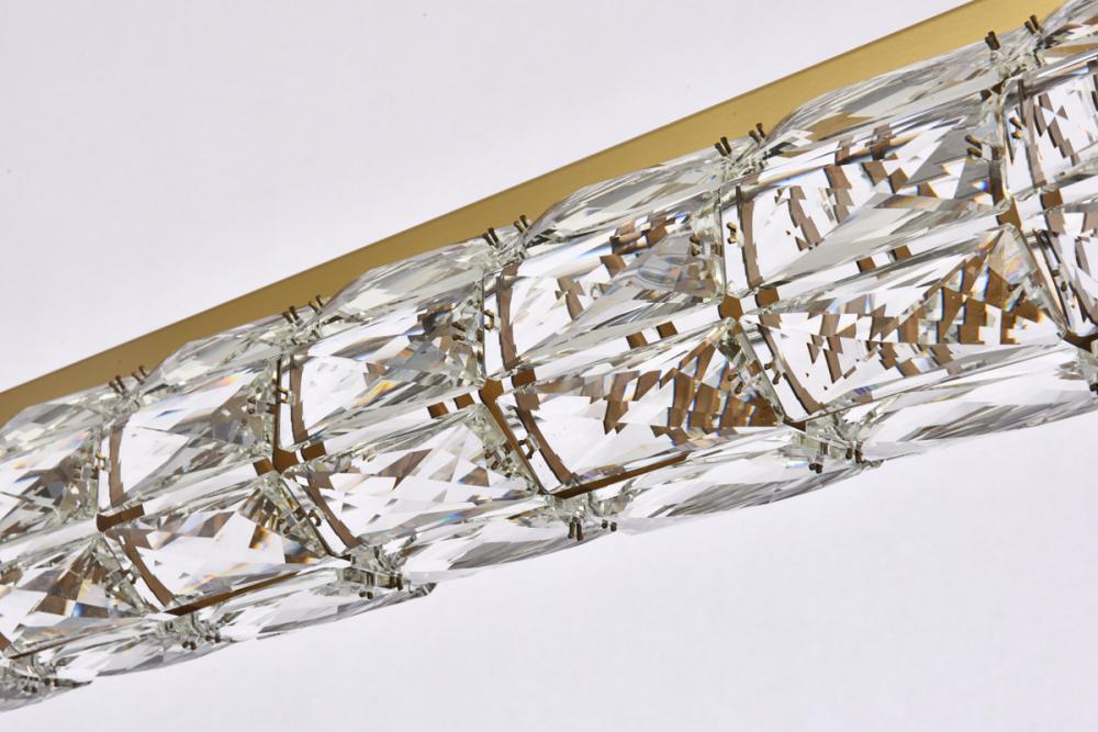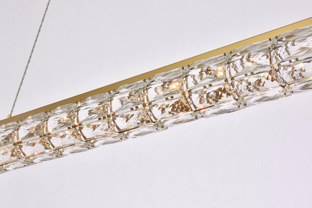 Valetta hanging fixtures dress up a living room, dining room, or bedroom without overwhelming the surrounding décor. This collection features an octagonal tube-shaped stainless-steel frame that’s covered almost entirely with shining rectangular clear crystals. A rectangular mounting plate is connected to the frame by slender cables that keep everything secure. A sleek metal finish completes this modern look with warm led lighting. Available in three sizes.