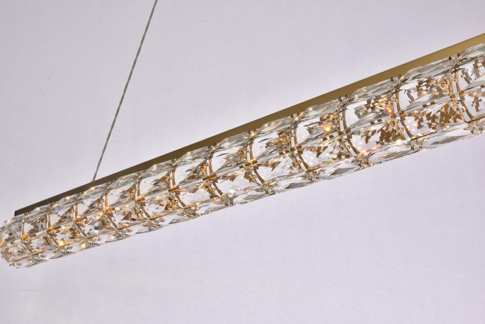 Valetta hanging fixtures dress up a living room, dining room, or bedroom without overwhelming the surrounding décor. This collection features an octagonal tube-shaped stainless-steel frame that’s covered almost entirely with shining rectangular clear crystals. A rectangular mounting plate is connected to the frame by slender cables that keep everything secure. A sleek metal finish completes this modern look with warm led lighting. Available in three sizes.