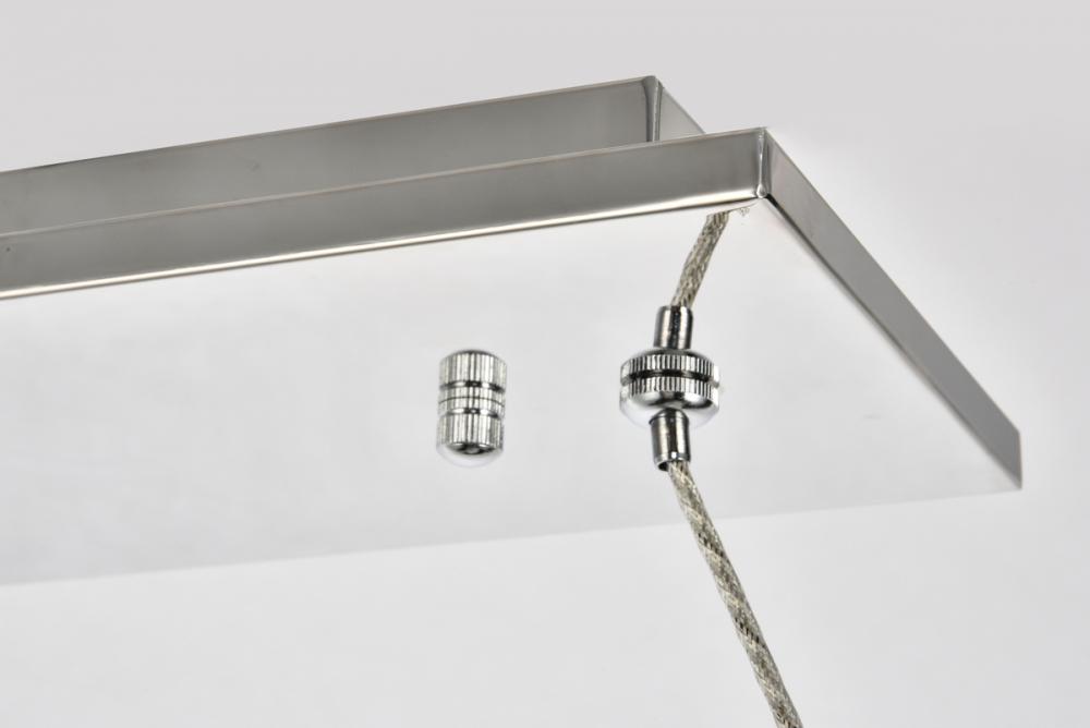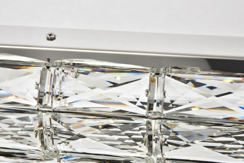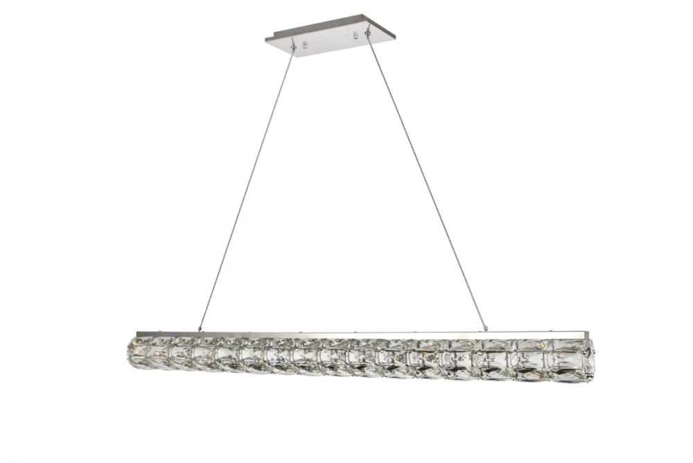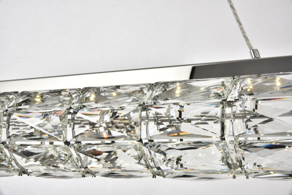 Valetta hanging fixtures dress up a living room, dining room, or bedroom without overwhelming the surrounding décor. This collection features an octagonal tube-shaped stainless-steel frame that’s covered almost entirely with shining rectangular royal-cut clear crystals. Faceted crystal octagonal crystals cover both ends as a charming finishing touch. A rectangular mounting plate is connected to the frame by slender cables that keep everything secure. A sleek chrome finish completes this modern look. Available in three different lengths.