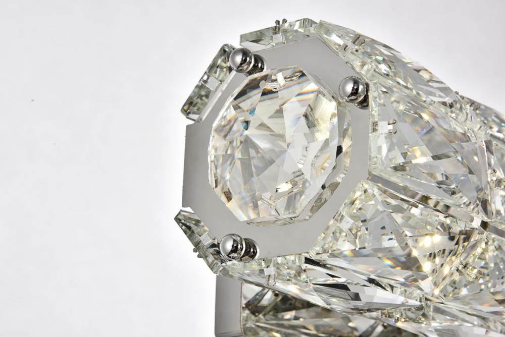Valetta wall sconces dress up a bathroom, office, or bedroom without overwhelming the surrounding décor. This collection features an octagonal tube-shaped stainless-steel frame covered almost entirely with shining rectangular royal-cut clear crystals. Faceted crystal octagonal crystals cover both ends as a charming finishing touch. The chrome-finished backplate is polished to a mirror shine and reflects the glittering crystals for additional sparkle. A sleek chrome finish completes this modern look. Available in four size options.