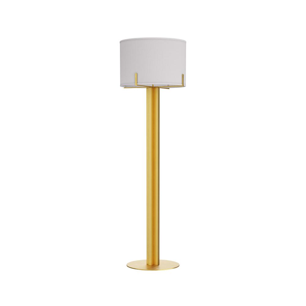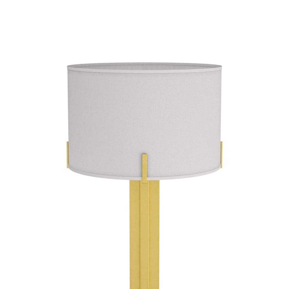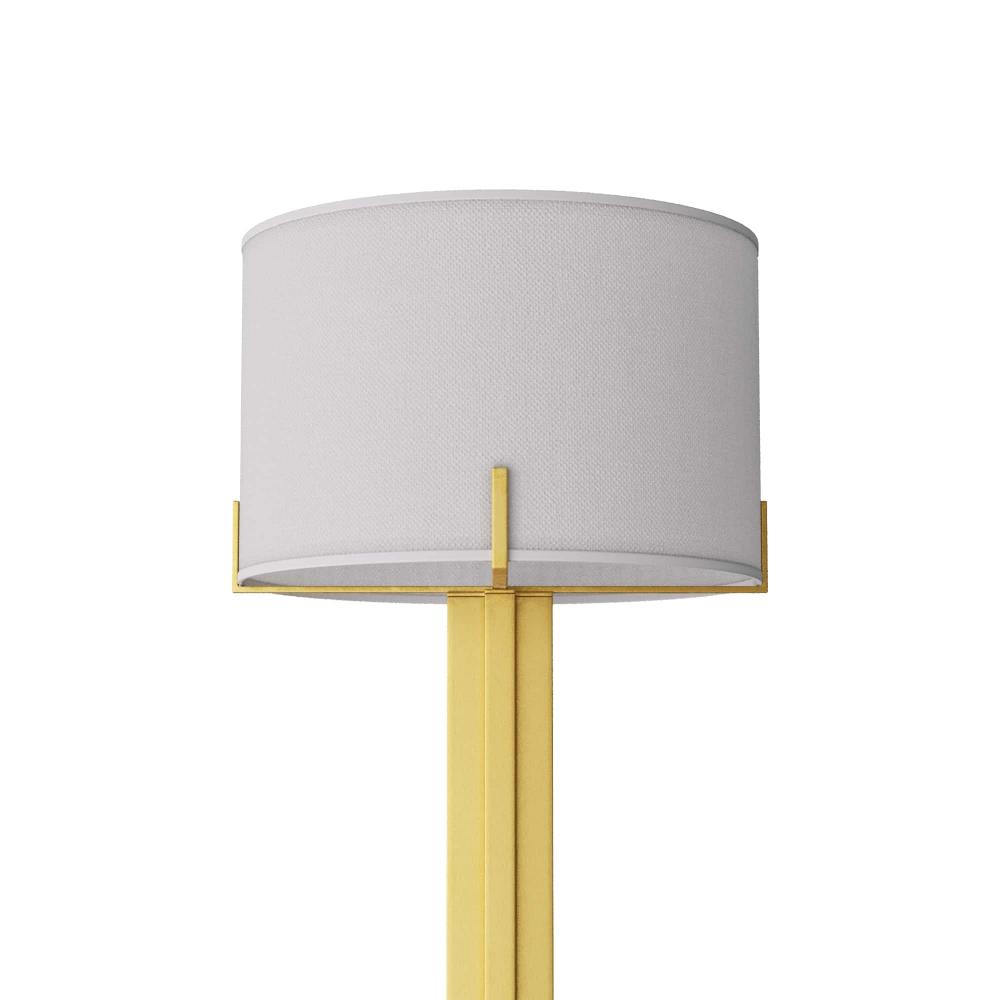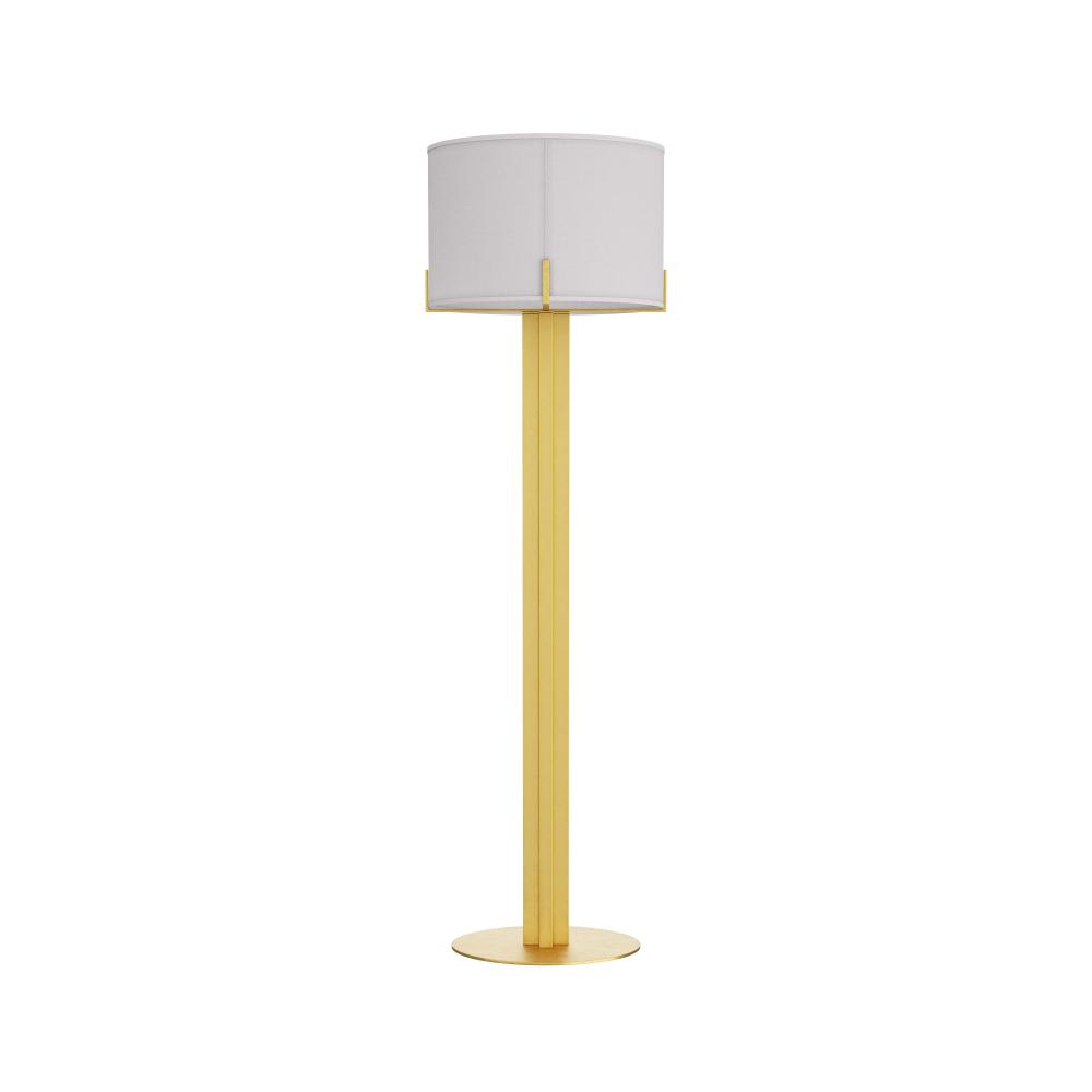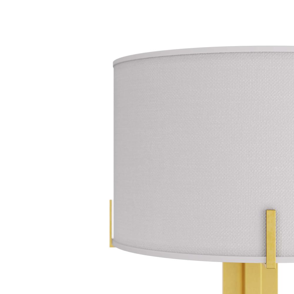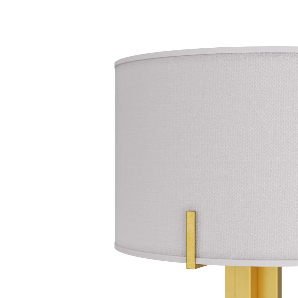 INSPIRED BY THE MODERNIST MOVEMENT, THE STREAMLINED VALIANT FLOOR LAMP IS A GLAMOROUS ADDITION TO ANY SPACE. THE LAMP IS FASHIONED IN A FRAMEWORK OF GLISTENING ANTIQUE BRASS ON IRON WITH METAL CLIPS SECURING THE FOLDED-LINEN DRUM SHADE INSIDE. THE OFF-WHITE LINEN SHADE IS LINED IN OFF-WHITE COTTON.