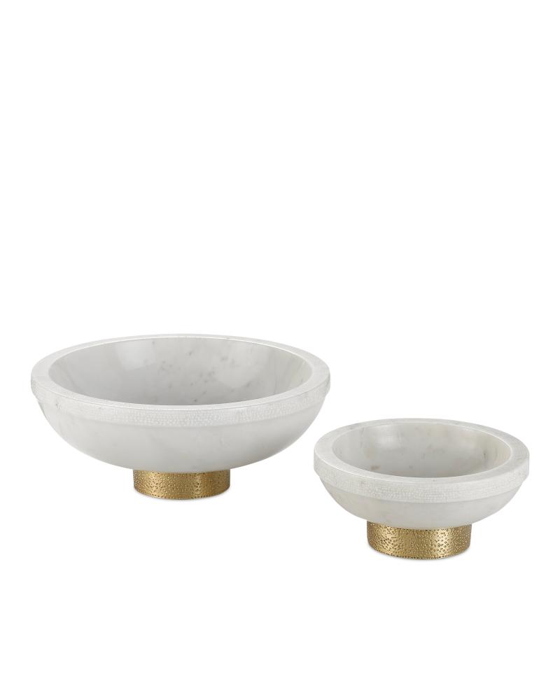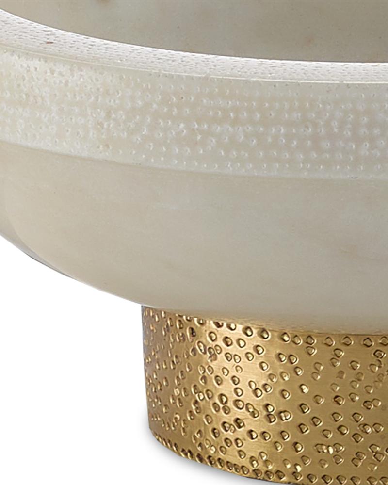 The Valor Small White Marble Bowl is made of white marble and brass in a brass finish, the golden tones of the base bringing this simple design more heft.