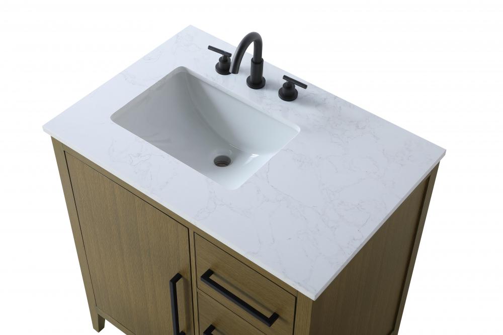 Bring both elegance and practicality to your bathroom with this transitional vanity, available in a selection of rich finishes that highlight the beauty of faux wood grain in shades of mocha, chestnut, and honey, along with classic white and modern grey. The flat door panels and sleek black metal pulls create a minimalist yet refined aesthetic, while the soft-closing drawers and tapered legs with levelers provide smooth, functional operation. Topped with a luxurious white engineered marble countertop and featuring a porcelain sink, this vanity combines timeless style with modern efficiency. Thoughtfully designed with U-shaped cutout for plumbing, it offers ample storage and easy installation, making it the perfect centerpiece for any bathroom.