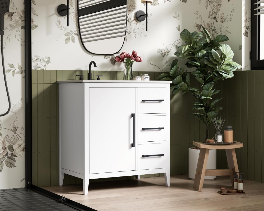 Bring both elegance and practicality to your bathroom with this transitional vanity, available in a selection of rich finishes that highlight the beauty of faux wood grain in shades of mocha, chestnut, and honey, along with classic white and modern grey. The flat door panels and sleek black metal pulls create a minimalist yet refined aesthetic, while the soft-closing drawers and tapered legs with levelers provide smooth, functional operation. Topped with a luxurious white engineered marble countertop and featuring a porcelain sink, this vanity combines timeless style with modern efficiency. Thoughtfully designed with U-shaped cutout for plumbing, it offers ample storage and easy installation, making it the perfect centerpiece for any bathroom.