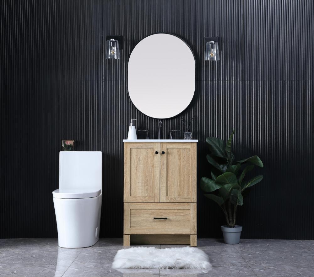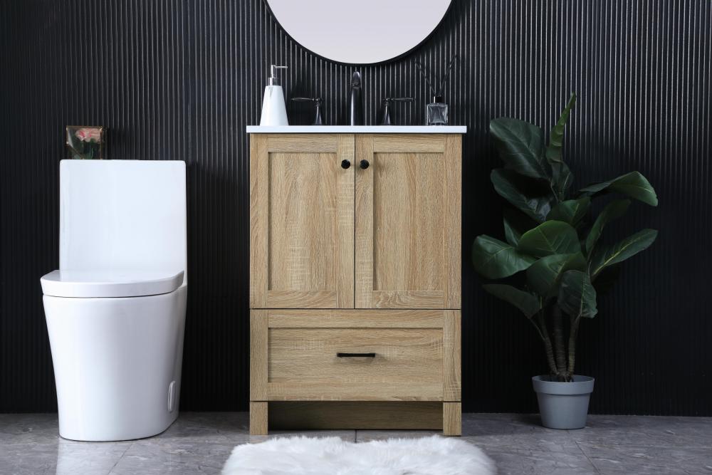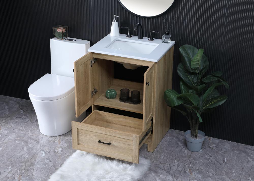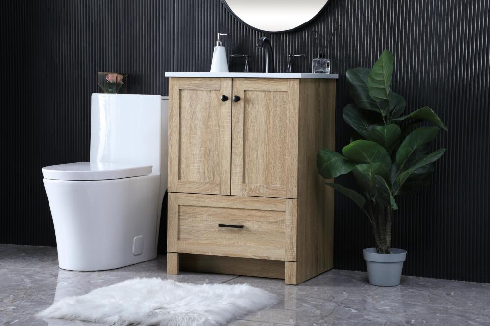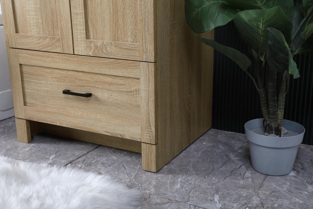 Revel in the beauty of a vanity that mimics the charm of real wood without the maintenance, boasting a faux wood look that adds a touch of natural warmth and rustic sophistication to your bathroom.
