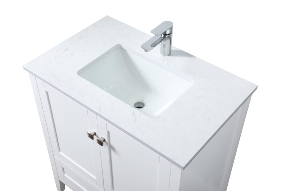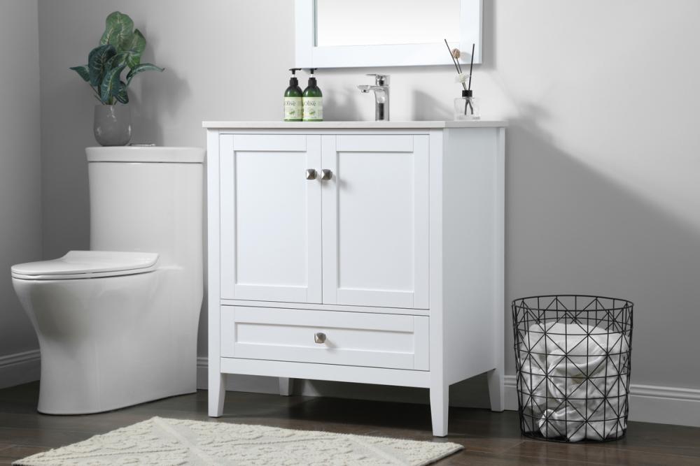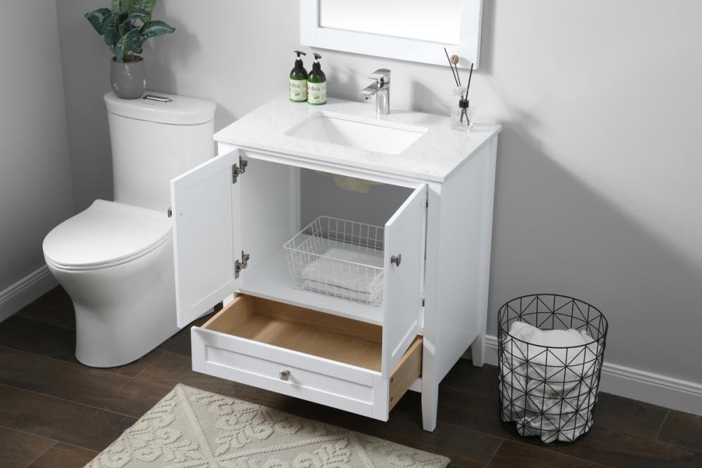Elevate your bathroom with our precision-crafted 30-inch vanity, showcasing a chic straight edge cut and an engineered marble top that adds a dash of modern elegance to your space. The design features a spacious cabinet with soft-close hinges, paired with a functional soft-close bottom drawer, providing ample and stylish storage. Complete with a sophisticated undermount porcelain sink, the vanity seamlessly merges style and practicality for an elevated bathroom experience. Adorned with three brushed nickel knobs, our vanity boasts stylish hardware, adding a personalized touch and ensuring convenient access to storage. Additionally, with a single pre-drilled hole for seamless faucet installation, our versatile vanity allows you to effortlessly personalize your bathroom, adding a final touch of elegance to your unique space. Redefine your bathroom experience with this stylish and functional addition.