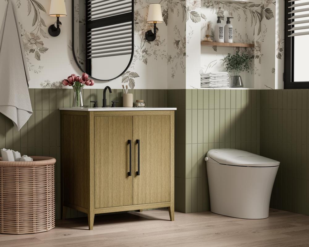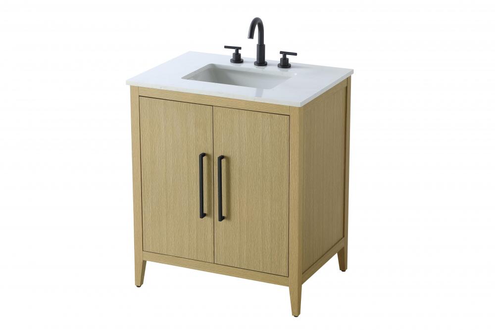 Bring both elegance and practicality to your bathroom with this transitional vanity, available in a selection of rich finishes that highlight the beauty of faux wood grain in shades of mocha, chestnut, and honey, along with classic white and modern grey. The flat door panels and sleek black metal pulls create a minimalist yet refined aesthetic, while the soft-closing drawers and tapered legs with levelers provide smooth, functional operation. Topped with a luxurious white engineered marble countertop and featuring a porcelain sink, this vanity combines timeless style with modern efficiency. Thoughtfully designed with U-shaped cutout for plumbing, it offers ample storage and easy installation, making it the perfect centerpiece for any bathroom.