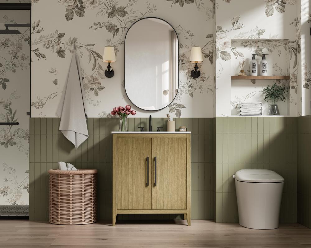 The minimalist flat door panels create a sleek, modern appearance, perfect for blending into transitional and contemporary bathroom designs.