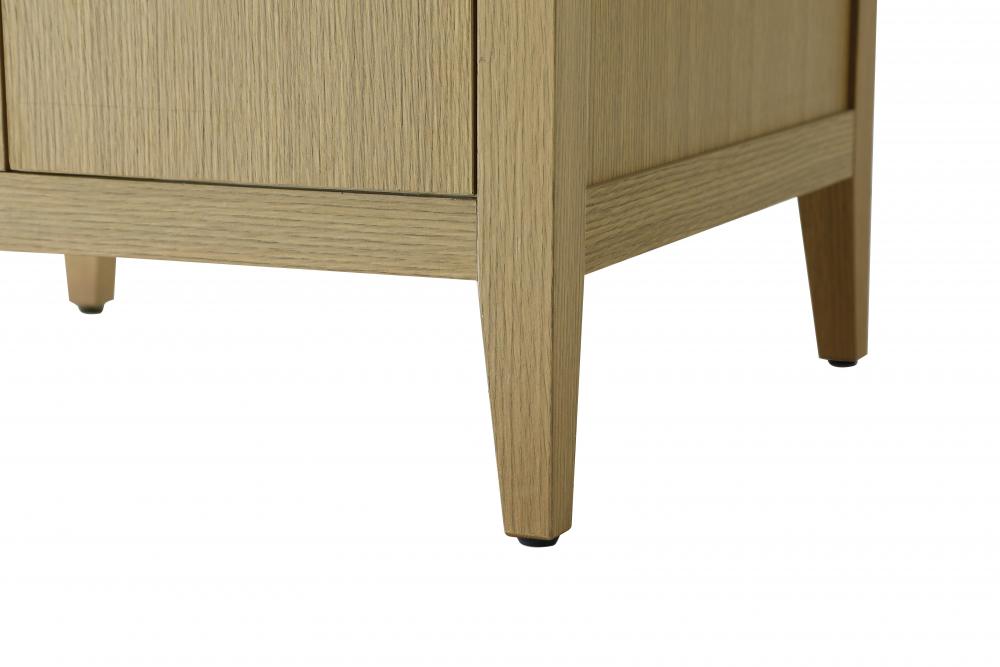 The vanity stands on tapered 5-inch solid wood legs with levelers for a balanced, polished look, combining modern style with practicality.