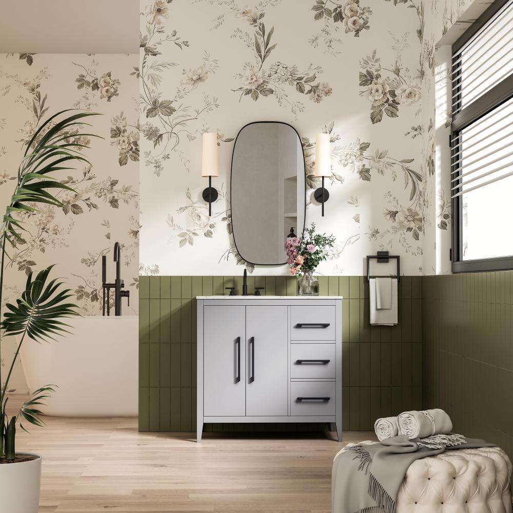 The vanity stands on tapered 5-inch solid wood legs with levelers for a balanced, polished look, combining modern style with practicality.