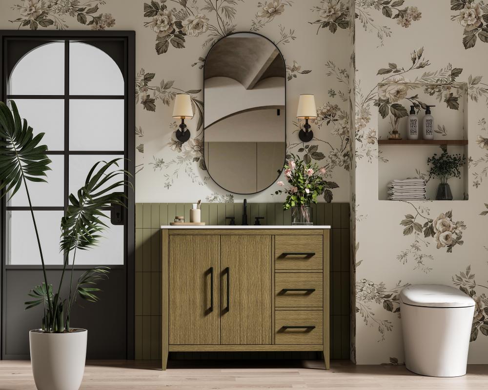 The minimalist flat door panels create a sleek, modern appearance, perfect for blending into transitional and contemporary bathroom designs.