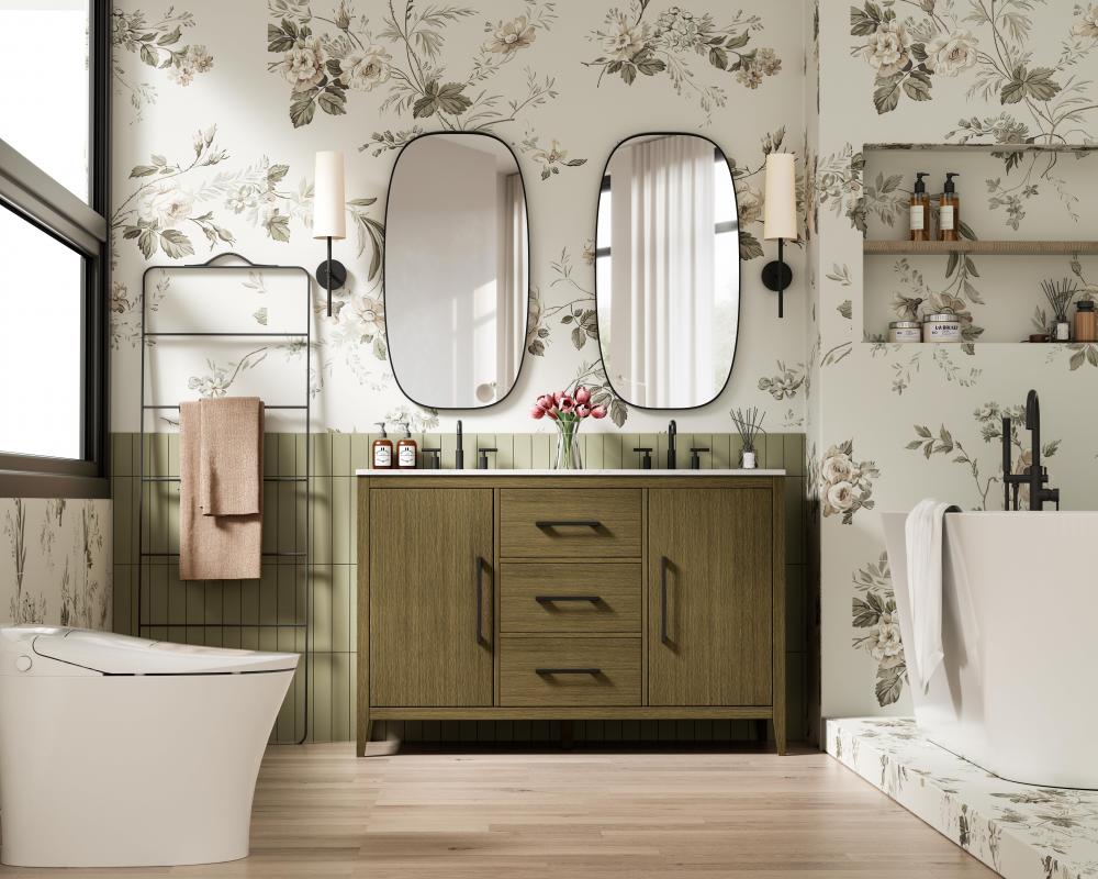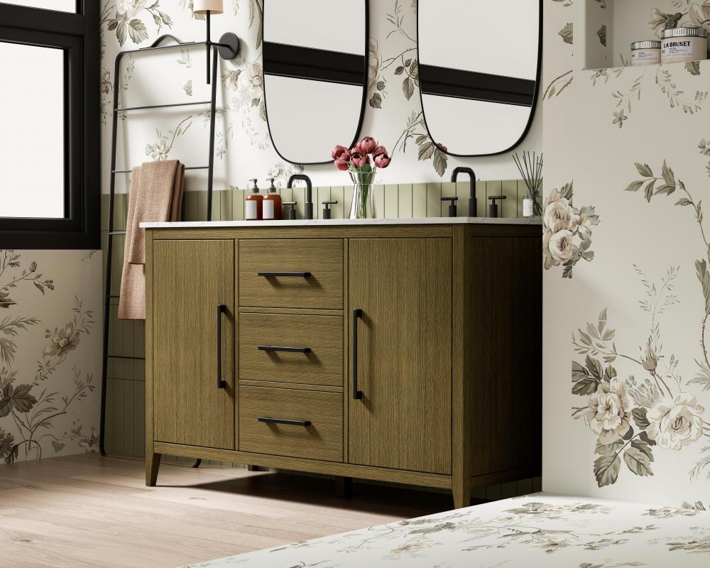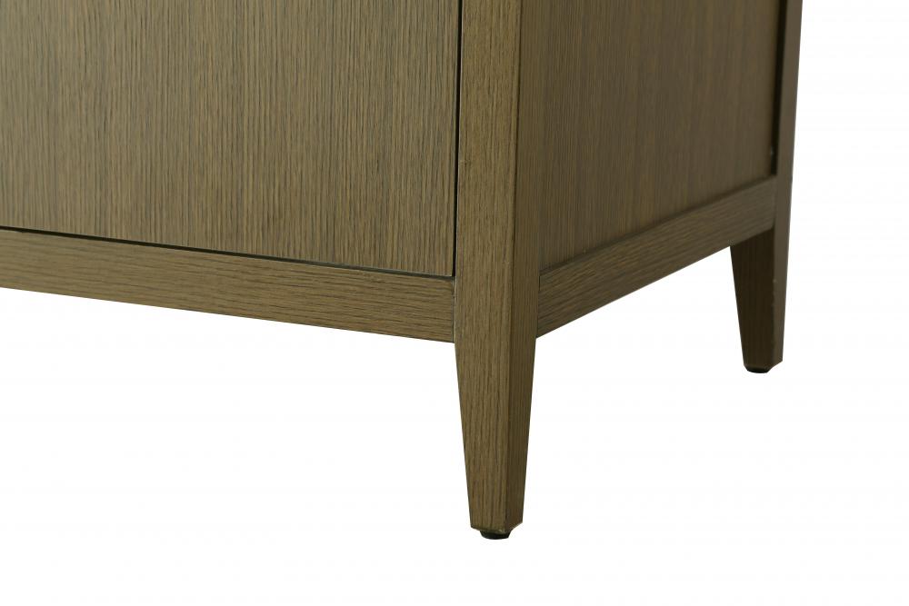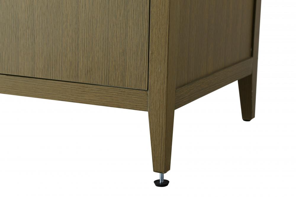 The vanity stands on tapered 5-inch solid wood legs with levelers for a balanced, polished look, combining modern style with practicality.
