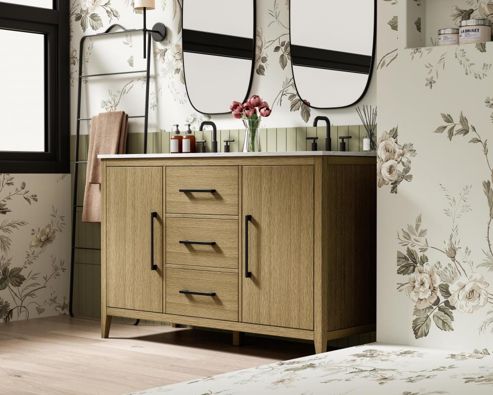 Bring both elegance and practicality to your bathroom with this transitional vanity, available in a selection of rich finishes that highlight the beauty of faux wood grain in shades of mocha, chestnut, and honey, along with classic white and modern grey. The flat door panels and sleek black metal pulls create a minimalist yet refined aesthetic, while the soft-closing drawers and tapered legs with levelers provide smooth, functional operation. Topped with a luxurious white engineered marble countertop and featuring a porcelain sink, this vanity combines timeless style with modern efficiency. Thoughtfully designed with U-shaped cutout for plumbing, it offers ample storage and easy installation, making it the perfect centerpiece for any bathroom.