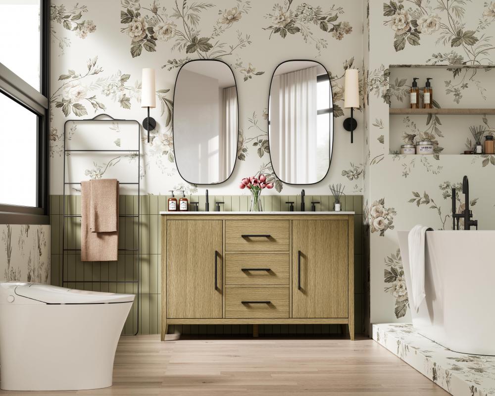 The minimalist flat door panels create a sleek, modern appearance, perfect for blending into transitional and contemporary bathroom designs.