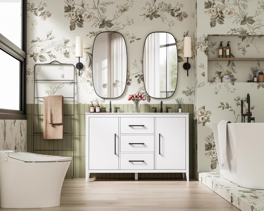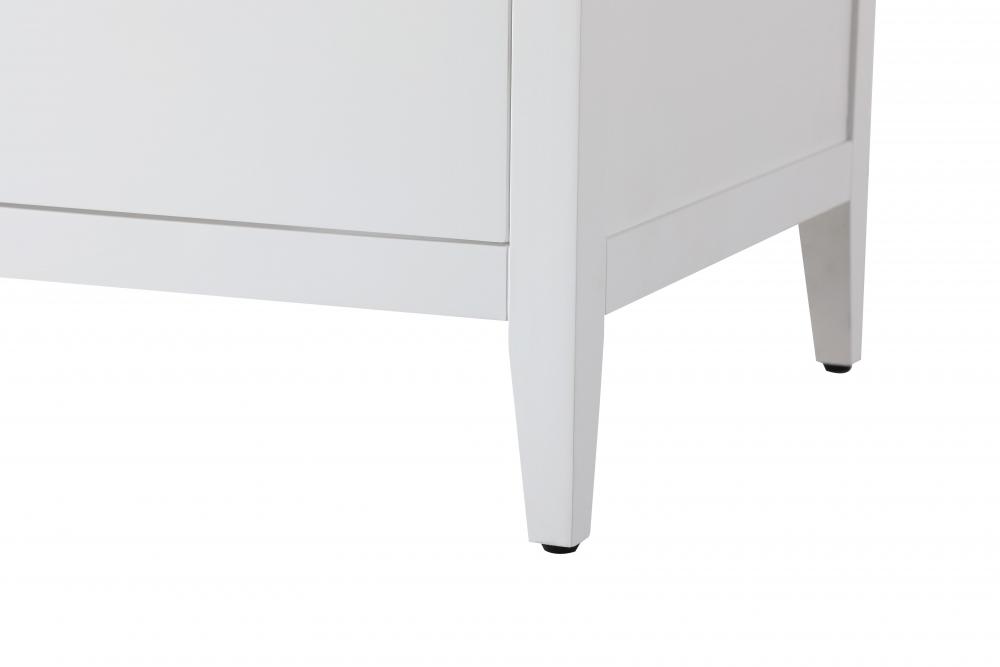 The vanity stands on tapered 5-inch solid wood legs with levelers for a balanced, polished look, combining modern style with practicality.