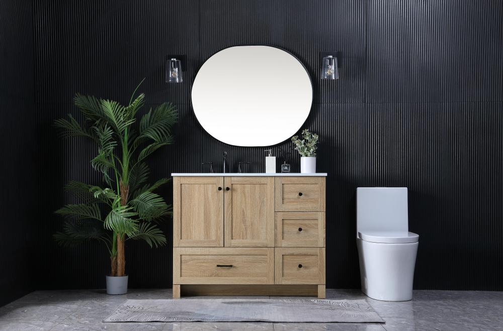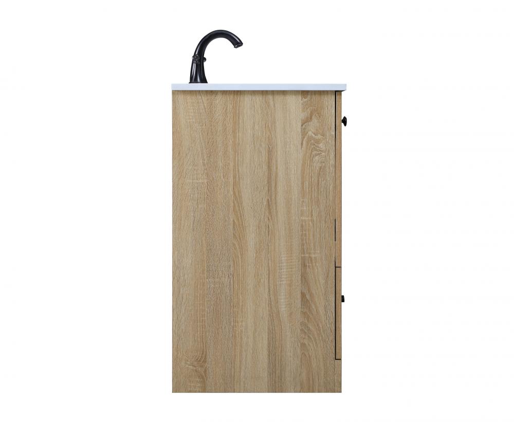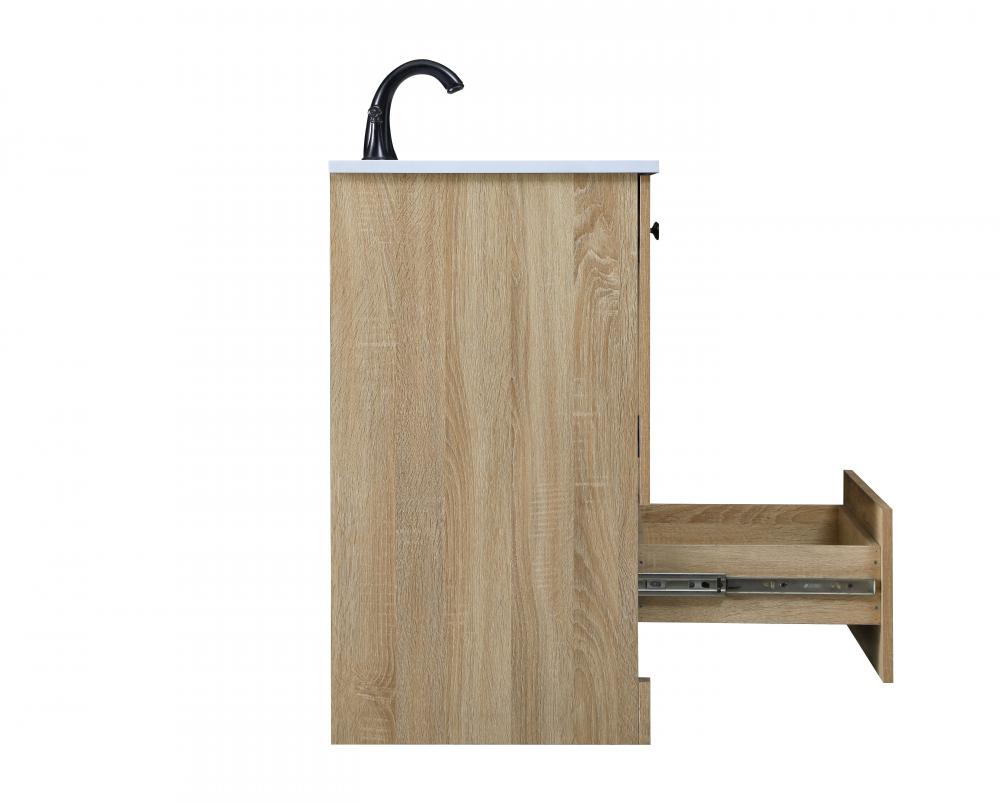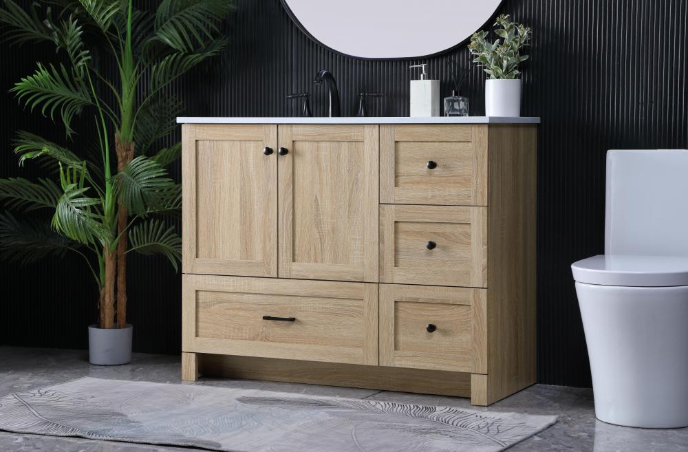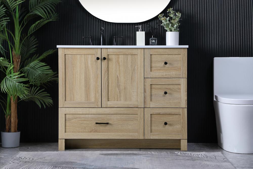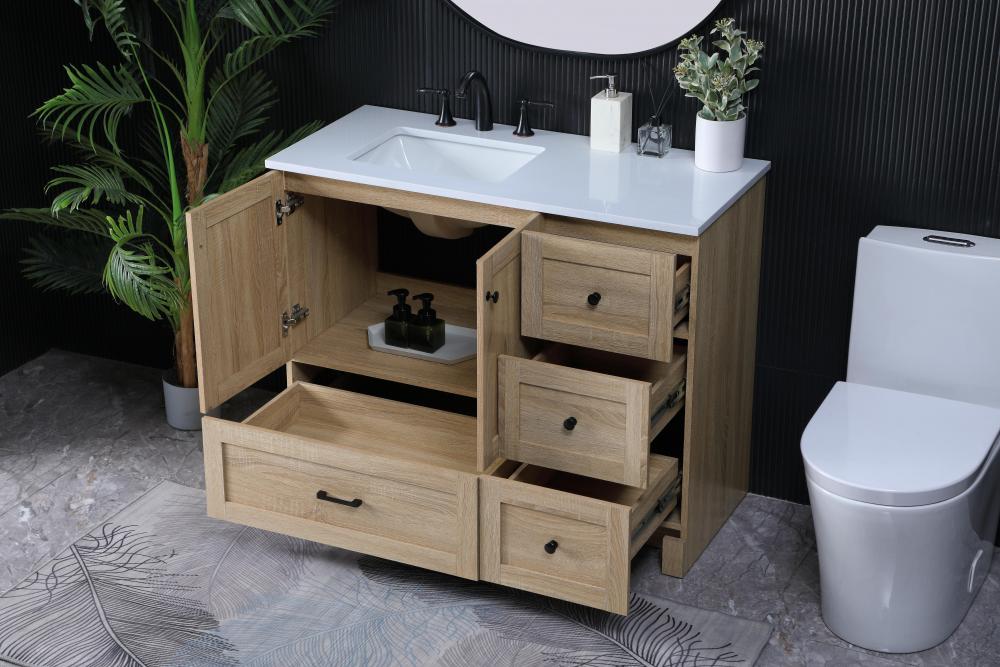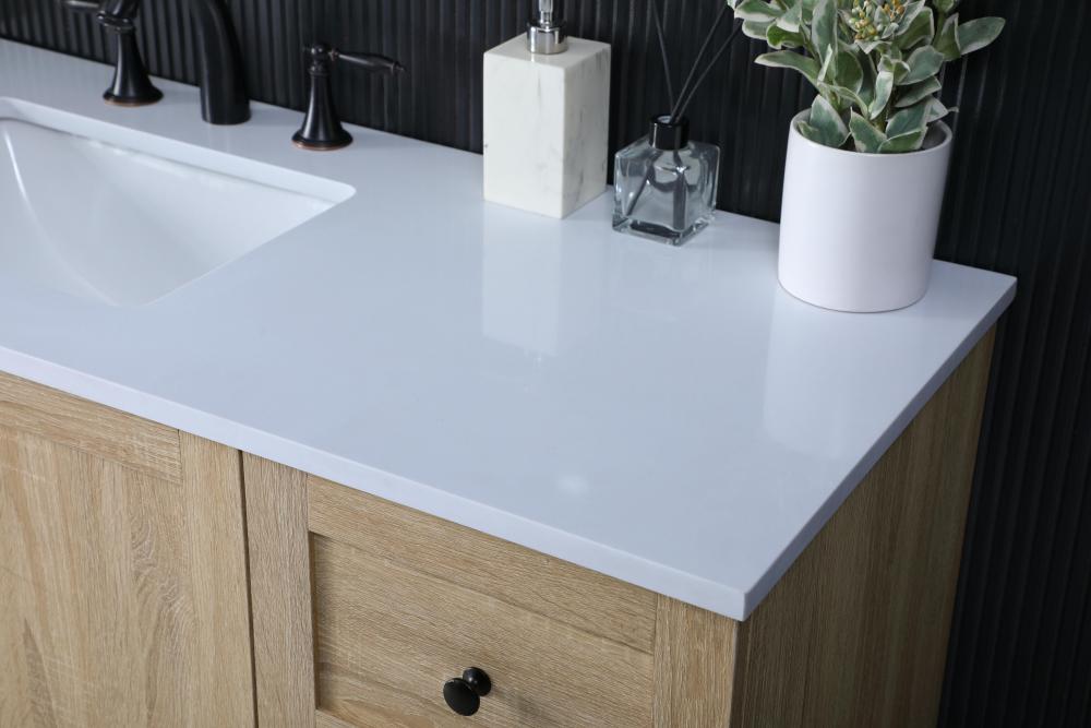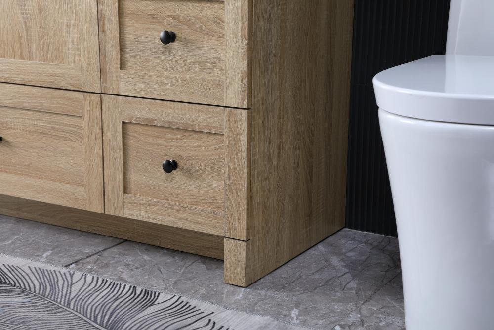 Revel in the beauty of a vanity that mimics the charm of real wood without the maintenance, boasting a faux wood look that adds a touch of natural warmth and rustic sophistication to your bathroom.