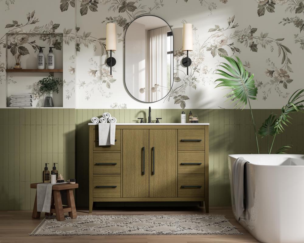 The vanity stands on tapered 5-inch solid wood legs with levelers for a balanced, polished look, combining modern style with practicality.