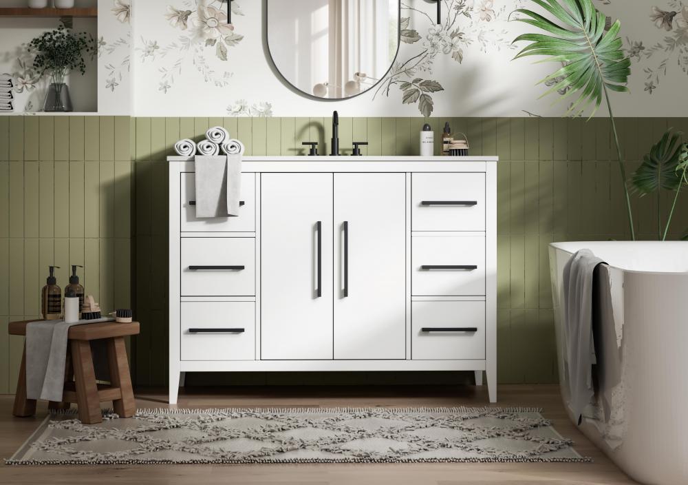 The vanity stands on tapered 5-inch solid wood legs with levelers for a balanced, polished look, combining modern style with practicality.