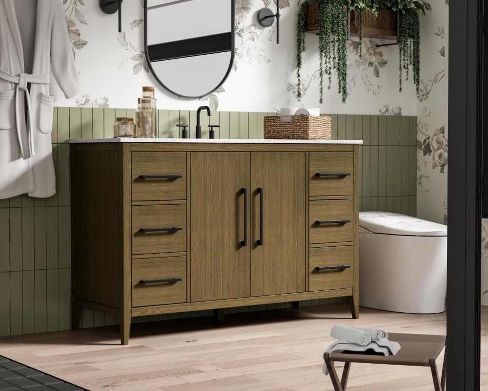 Bring both elegance and practicality to your bathroom with this transitional vanity, available in a selection of rich finishes that highlight the beauty of faux wood grain in shades of mocha, chestnut, and honey, along with classic white and modern grey. The flat door panels and sleek black metal pulls create a minimalist yet refined aesthetic, while the soft-closing drawers and tapered legs with levelers provide smooth, functional operation. Topped with a luxurious white engineered marble countertop and featuring a porcelain sink, this vanity combines timeless style with modern efficiency. Thoughtfully designed with U-shaped cutout for plumbing, it offers ample storage and easy installation, making it the perfect centerpiece for any bathroom.