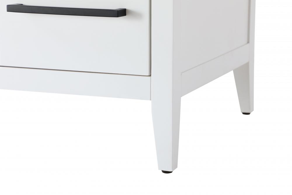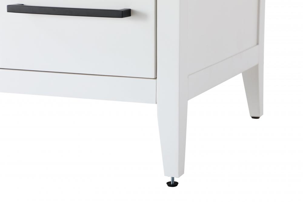 The vanity stands on tapered 5-inch solid wood legs with levelers for a balanced, polished look, combining modern style with practicality.