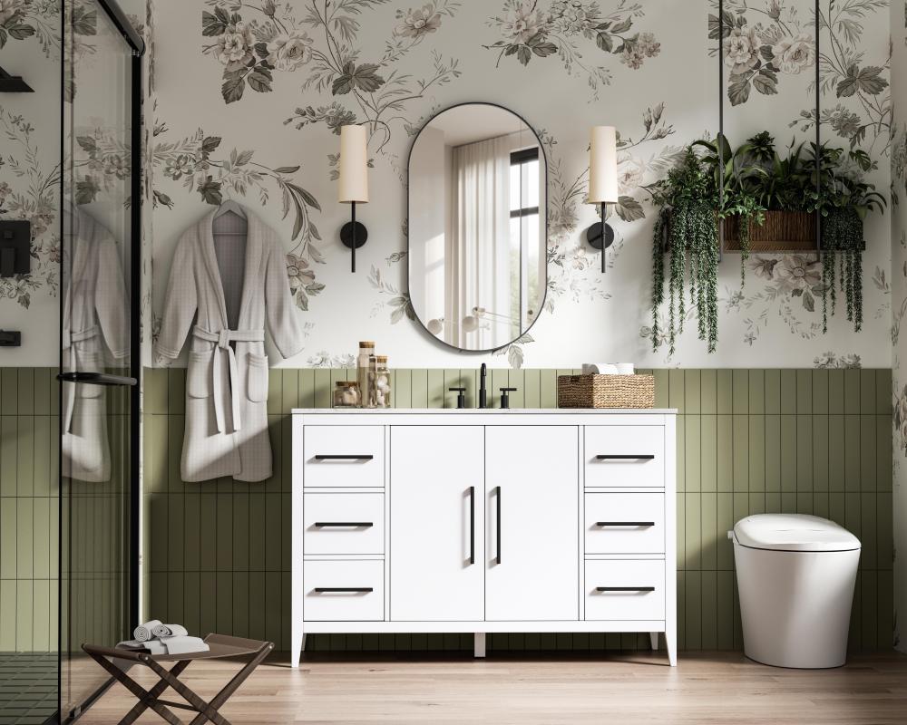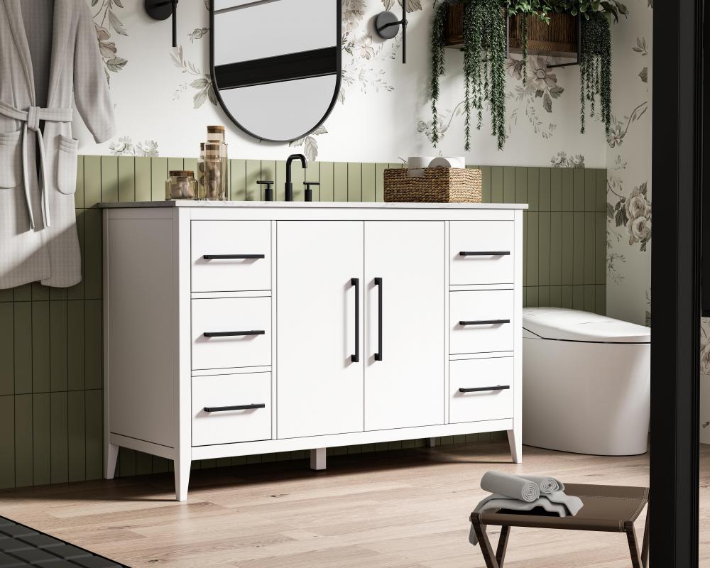Bring both elegance and practicality to your bathroom with this transitional vanity, available in a selection of rich finishes that highlight the beauty of faux wood grain in shades of mocha, chestnut, and honey, along with classic white and modern grey. The flat door panels and sleek black metal pulls create a minimalist yet refined aesthetic, while the soft-closing drawers and tapered legs with levelers provide smooth, functional operation. Topped with a luxurious white engineered marble countertop and featuring a porcelain sink, this vanity combines timeless style with modern efficiency. Thoughtfully designed with U-shaped cutout for plumbing, it offers ample storage and easy installation, making it the perfect centerpiece for any bathroom.