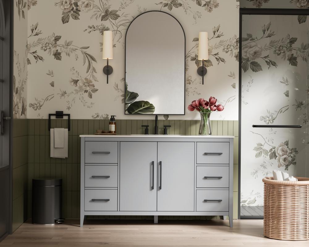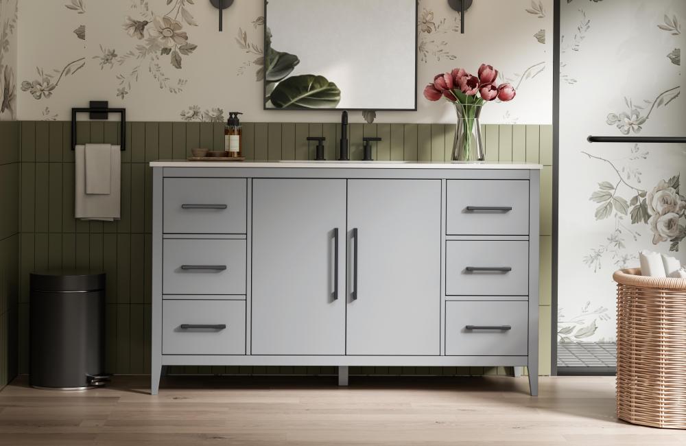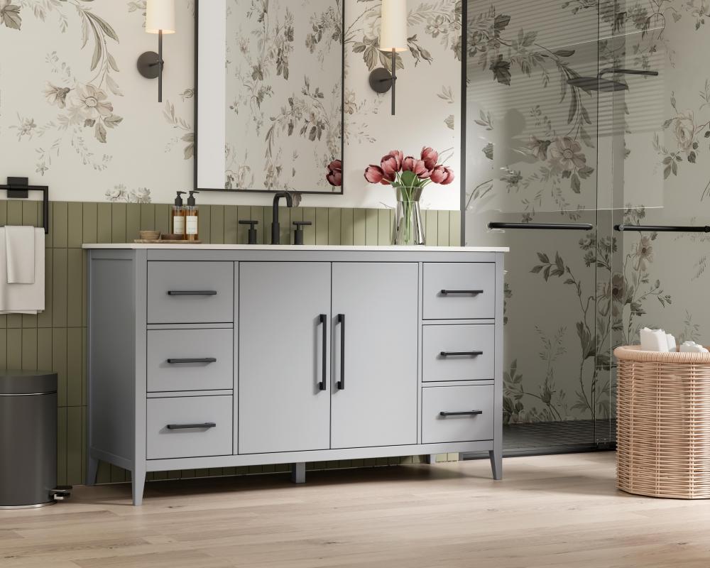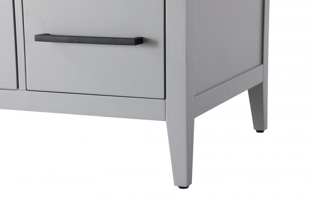 The vanity stands on tapered 5-inch solid wood legs with levelers for a balanced, polished look, combining modern style with practicality.