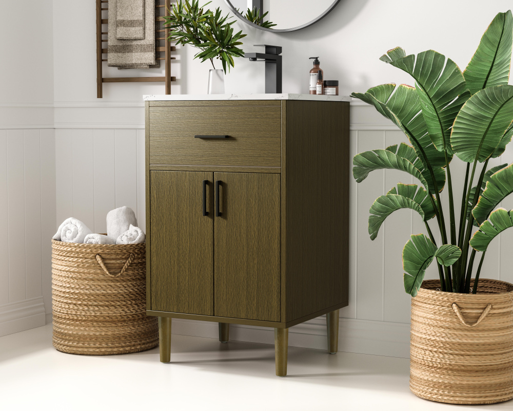 A natural wood-inspired finish adds warmth and texture to your bathroom.