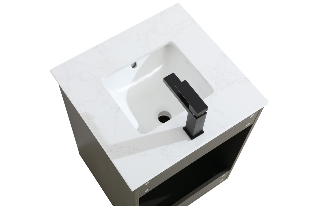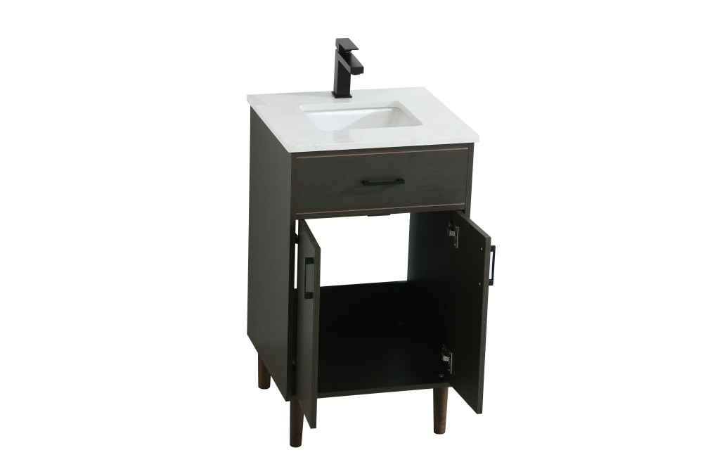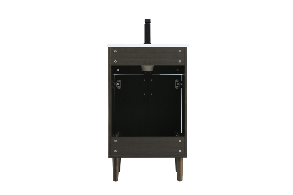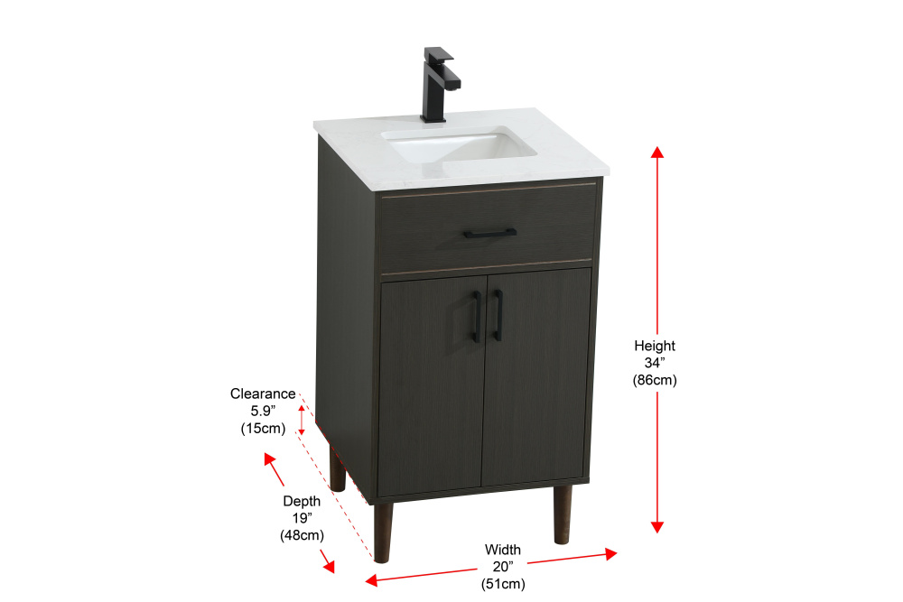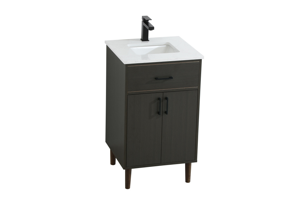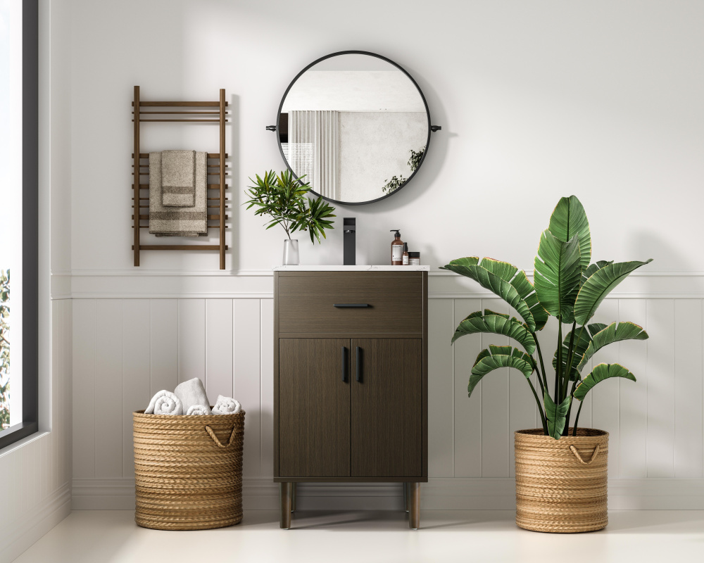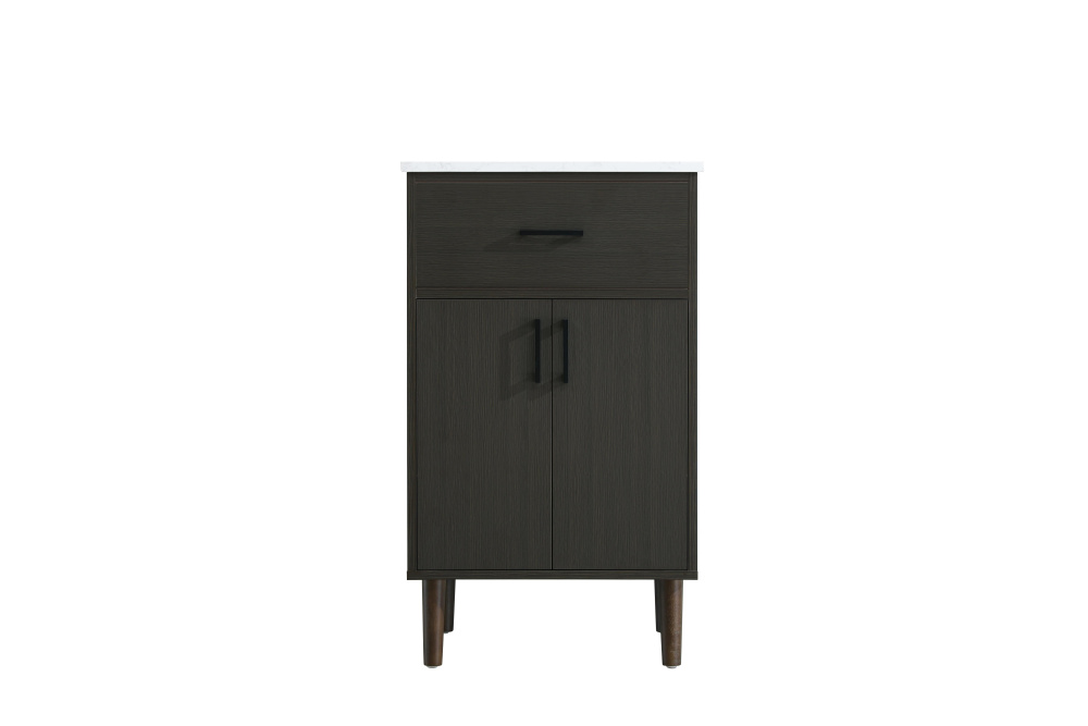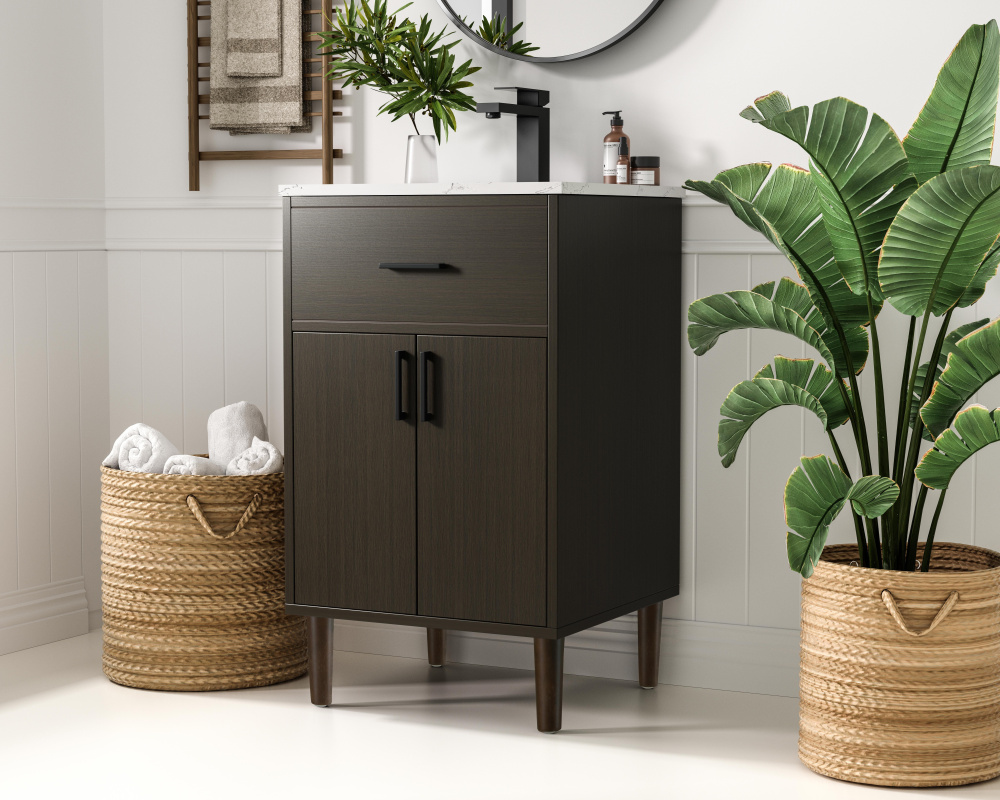 Transform your bathroom with this mid-century modern vanity, designed to bring both functionality and a sense of style to your space. Its clean lines, minimalist design, and tapered solid wood legs evoke a timeless charm, perfect for blending with modern and transitional interiors. The engineered marble countertop, with its unique faux marble veining, adds a refined, luxurious touch, while the porcelain sink is both durable and easy to maintain. Practicality meets aesthetics with a faux drawer for balanced design and a spacious double-door cabinet for efficient storage. Constructed from solid wood and MDF, this vanity offers lasting durability, while adjustable foot levelers ensure stability on any floor. Shipped mostly assembled, the solid wood legs can be effortlessly twisted into place, making installation quick and hassle-free.