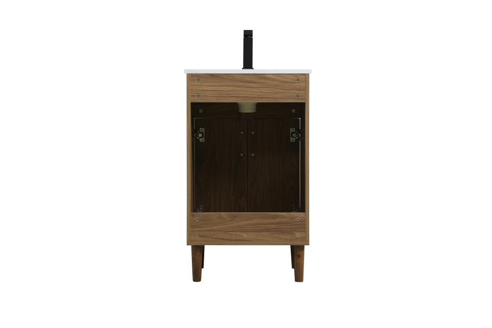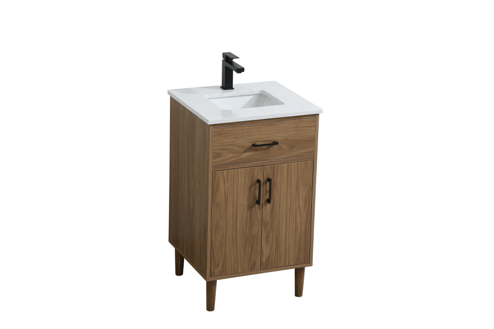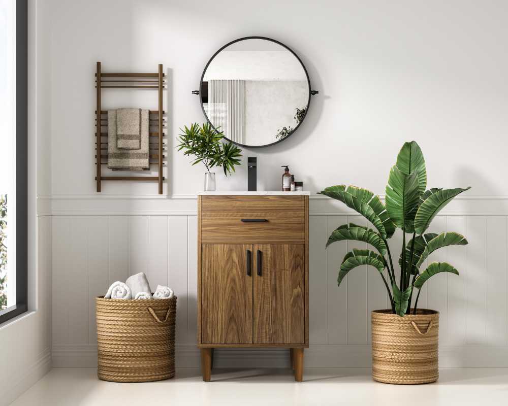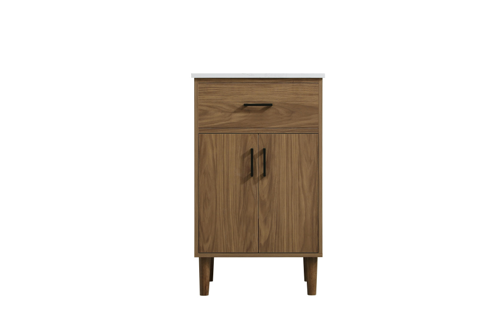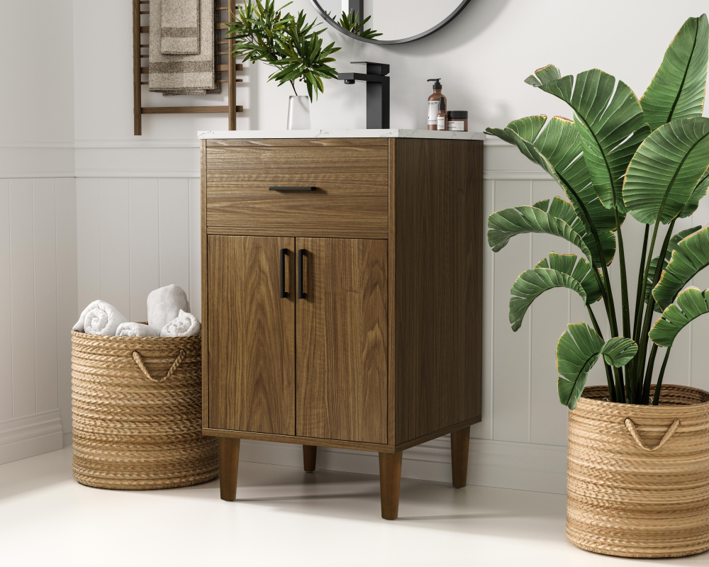 Transform your bathroom with this mid-century modern vanity, designed to bring both functionality and a sense of style to your space. Its clean lines, minimalist design, and tapered solid wood legs evoke a timeless charm, perfect for blending with modern and transitional interiors. The engineered marble countertop, with its unique faux marble veining, adds a refined, luxurious touch, while the porcelain sink is both durable and easy to maintain. Practicality meets aesthetics with a faux drawer for balanced design and a spacious double-door cabinet for efficient storage. Constructed from solid wood and MDF, this vanity offers lasting durability, while adjustable foot levelers ensure stability on any floor. Shipped mostly assembled, the solid wood legs can be effortlessly twisted into place, making installation quick and hassle-free.