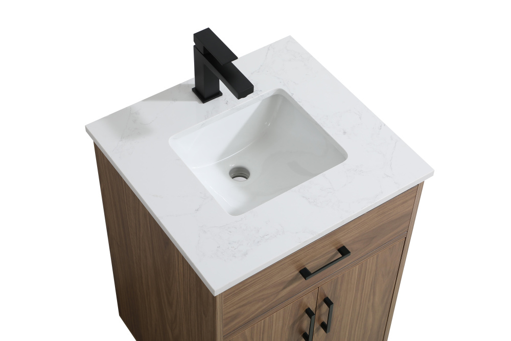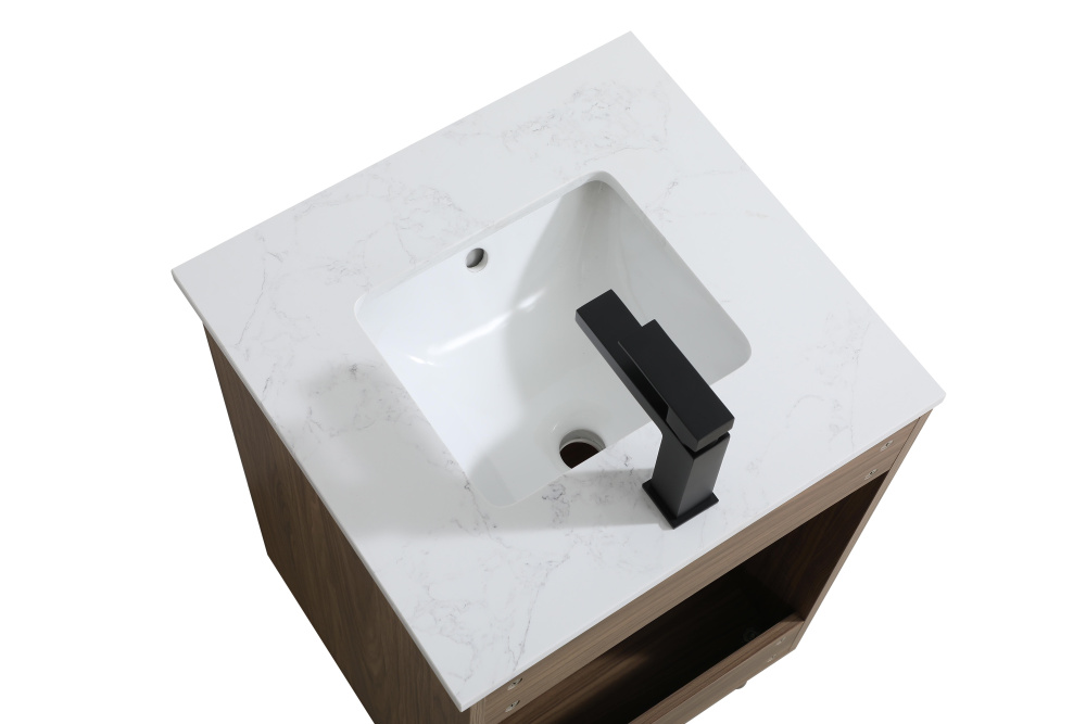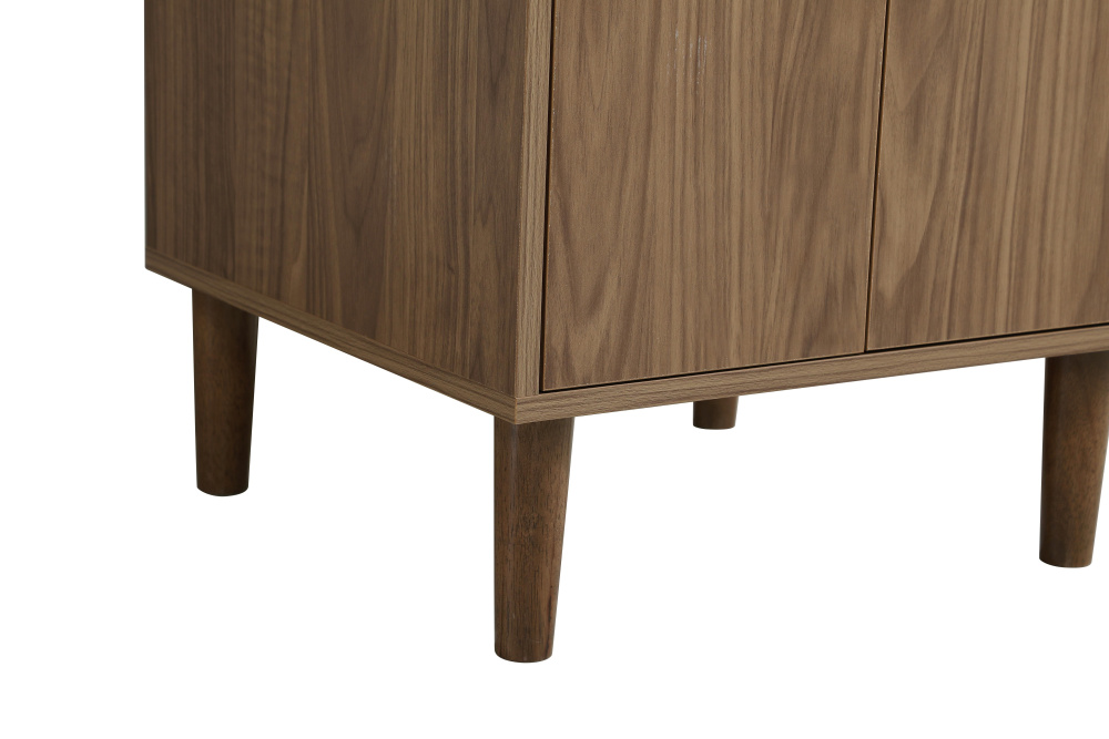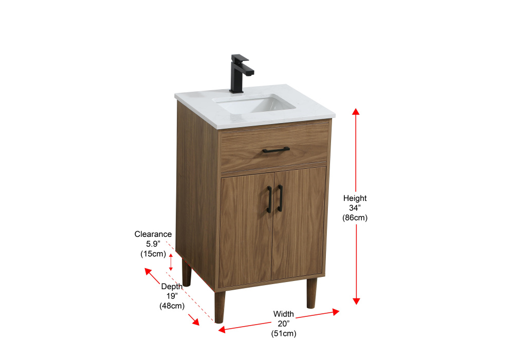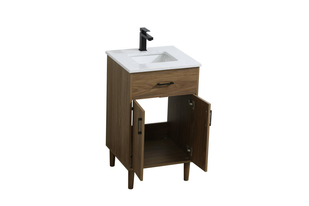 Transform your bathroom with this mid-century modern vanity, designed to bring both functionality and a sense of style to your space. Its clean lines, minimalist design, and tapered solid wood legs evoke a timeless charm, perfect for blending with modern and transitional interiors. The engineered marble countertop, with its unique faux marble veining, adds a refined, luxurious touch, while the porcelain sink is both durable and easy to maintain. Practicality meets aesthetics with a faux drawer for balanced design and a spacious double-door cabinet for efficient storage. Constructed from solid wood and MDF, this vanity offers lasting durability, while adjustable foot levelers ensure stability on any floor. Shipped mostly assembled, the solid wood legs can be effortlessly twisted into place, making installation quick and hassle-free.