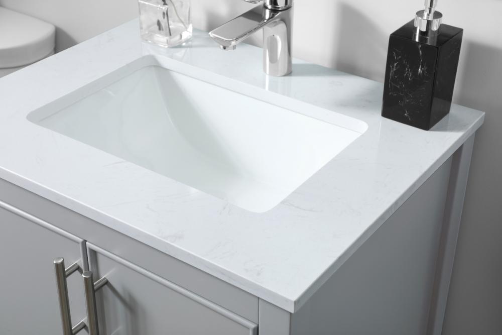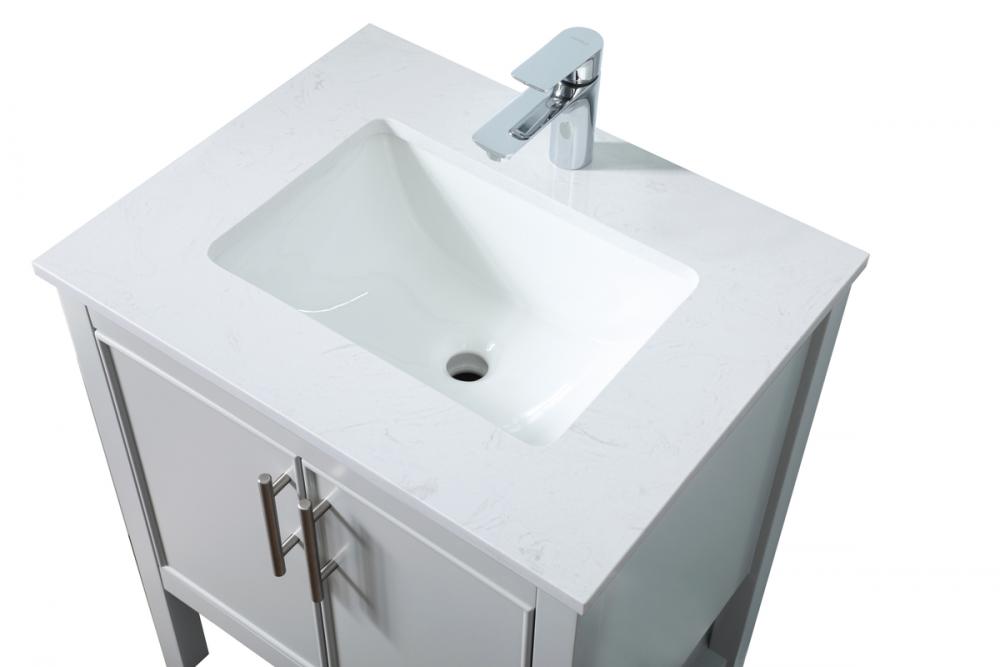 Experience the epitome of modern elegance with our meticulously crafted 24-inch vanity. Boasting a chic straight edge cut and an engineered marble top, this design features one functional cabinet with two soft-close doors, ensuring seamless and stylish access to ample storage. The vanity is complemented by a sophisticated undermount porcelain sink, merging style with practicality for an elevated bathroom experience. Adorned with two sleek pulls and featuring a lower open shelf, it seamlessly combines contemporary aesthetics with functional design. Additionally, the single pre-drilled hole allows for easy faucet personalization, adding a final touch of elegance to your unique bathroom. Redefine your space with this versatile and stylish addition.