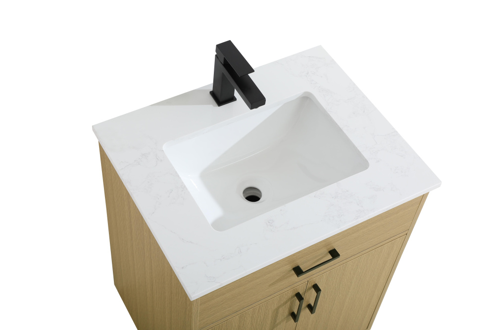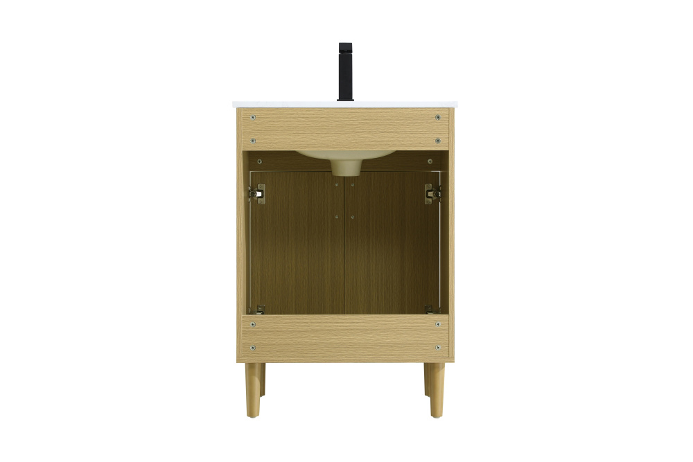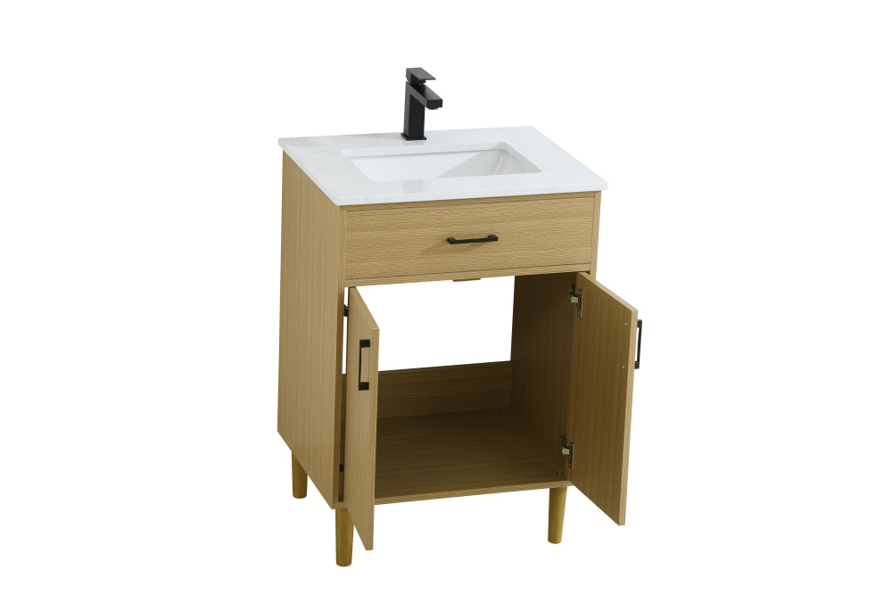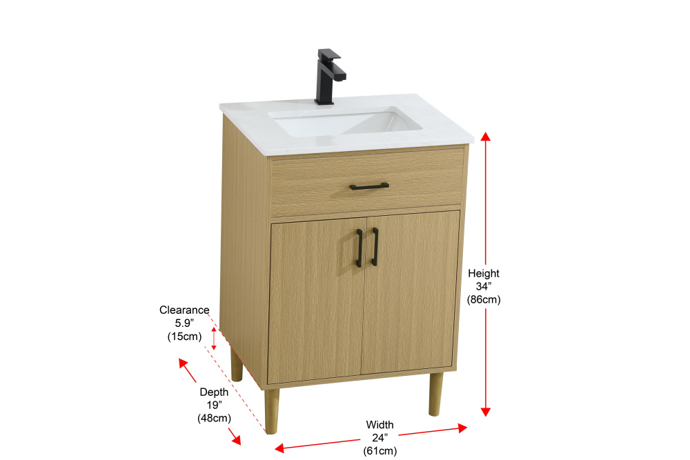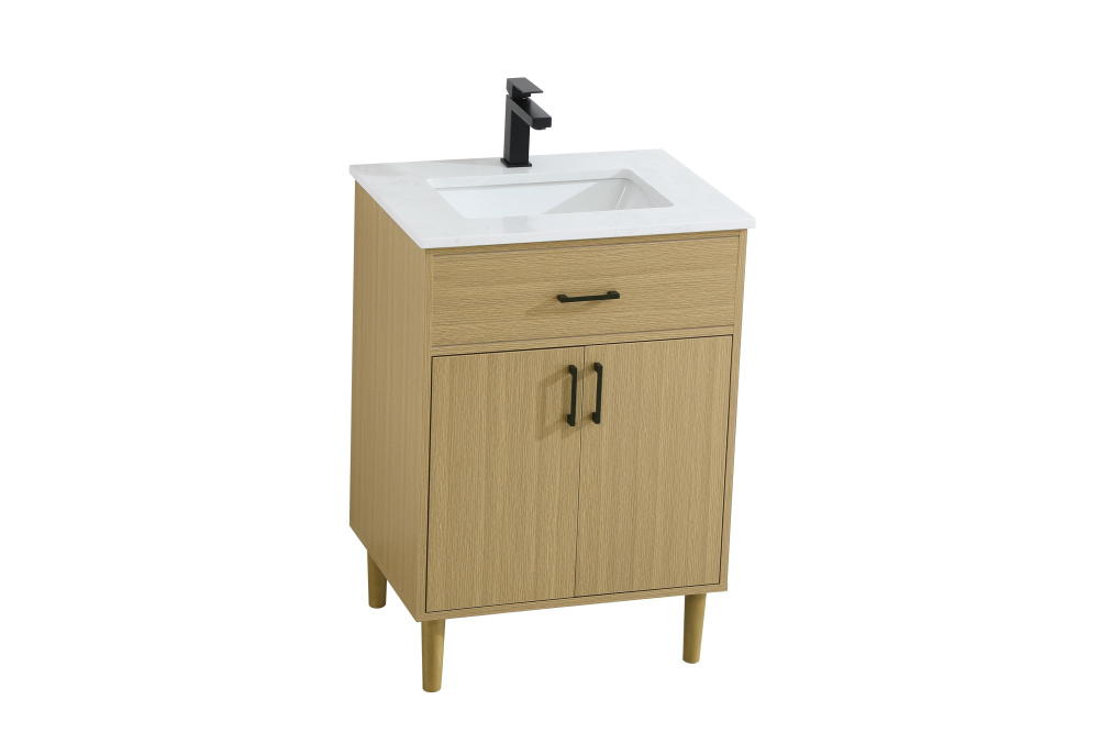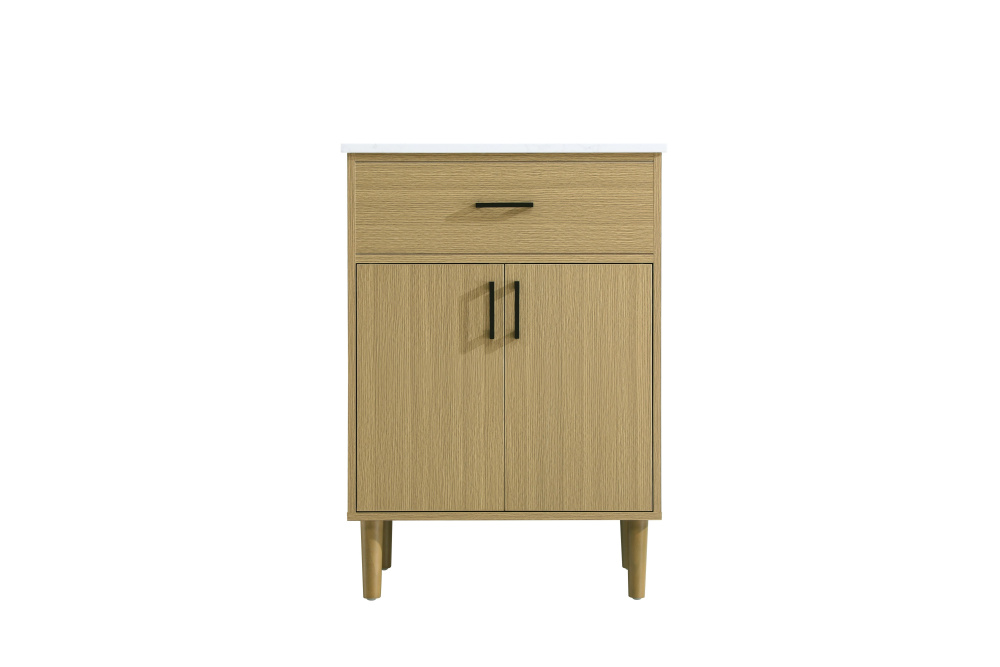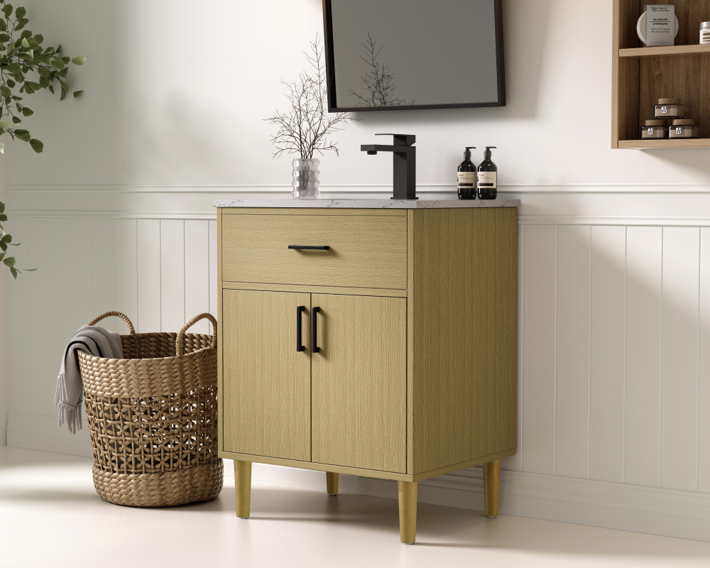 Transform your bathroom with this mid-century modern vanity, designed to bring both functionality and a sense of style to your space. Its clean lines, minimalist design, and tapered solid wood legs evoke a timeless charm, perfect for blending with modern and transitional interiors. The engineered marble countertop, with its unique faux marble veining, adds a refined, luxurious touch, while the porcelain sink is both durable and easy to maintain. Practicality meets aesthetics with a faux drawer for balanced design and a spacious double-door cabinet for efficient storage. Constructed from solid wood and MDF, this vanity offers lasting durability, while adjustable foot levelers ensure stability on any floor. Shipped mostly assembled, the solid wood legs can be effortlessly twisted into place, making installation quick and hassle-free.