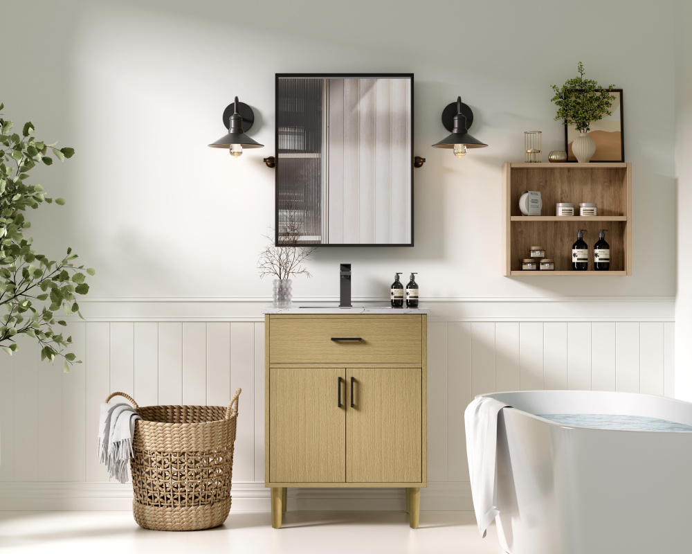 A natural wood-inspired finish adds warmth and texture to your bathroom.