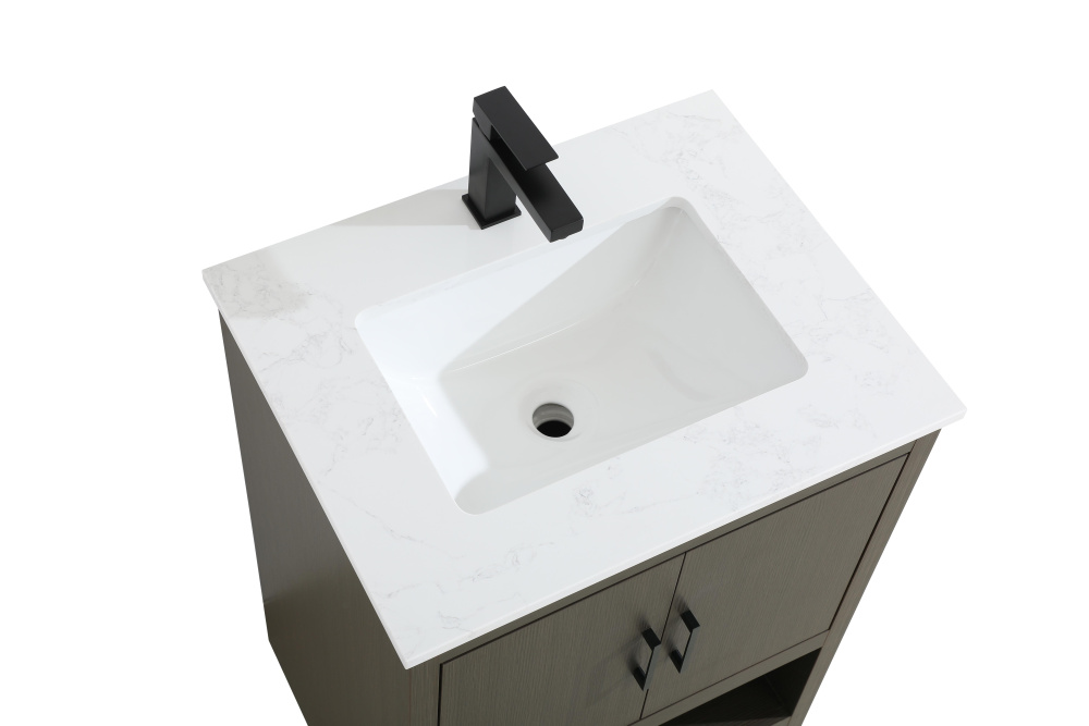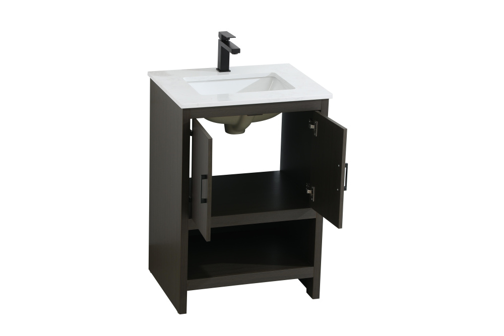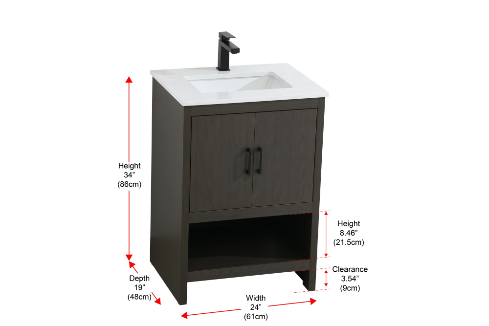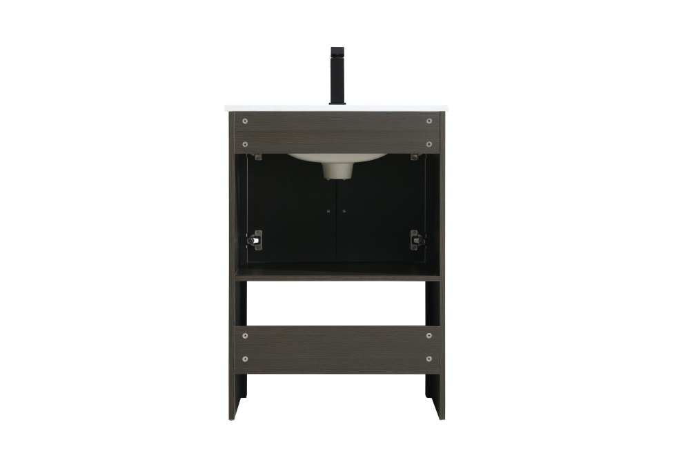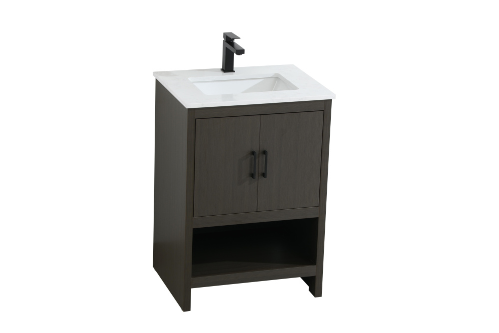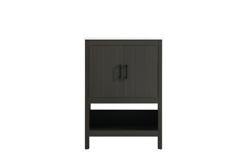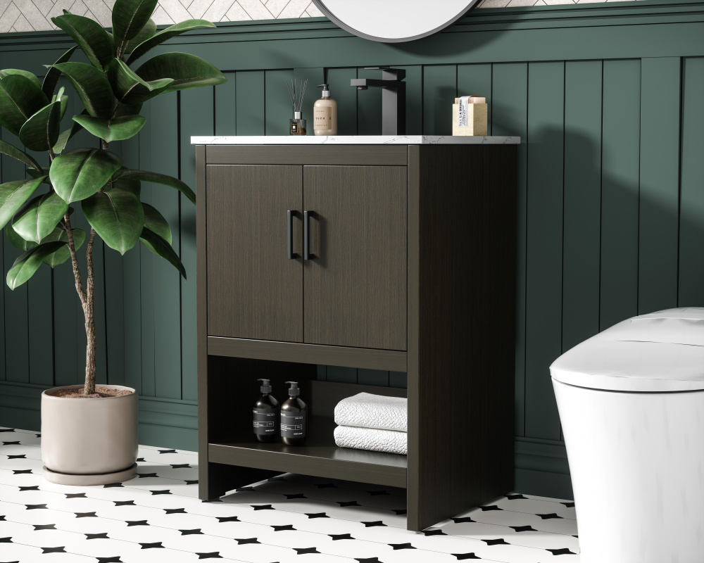 Bring modern style and practicality to your bathroom with this sleek vanity, designed to complement contemporary spaces. The flat-panel doors create a clean, minimalist look, while the open bottom shelf provides functional storage or a space to display decorative items. The engineered marble countertop showcases unique faux marbling, adding a refined and distinct touch to the design. The durable porcelain sink is easy to maintain, and the single pre-drilled faucet hole simplifies the installation process. Constructed from high-quality MDF with a versatile woodgrain finish, this vanity combines durability with timeless style. With adjustable foot levelers for stability on uneven floors and a fully assembled design, this piece offers a seamless addition to your bathroom.