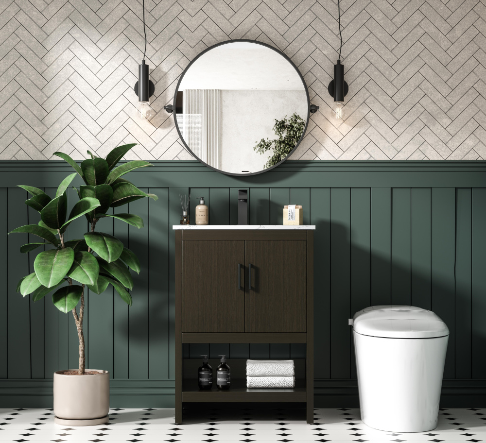 A natural wood-inspired finish adds warmth and texture to your bathroom.
