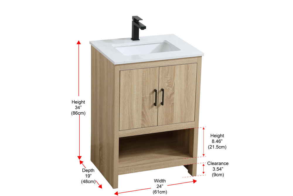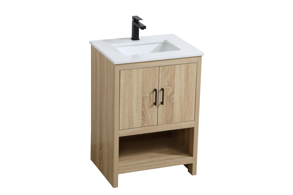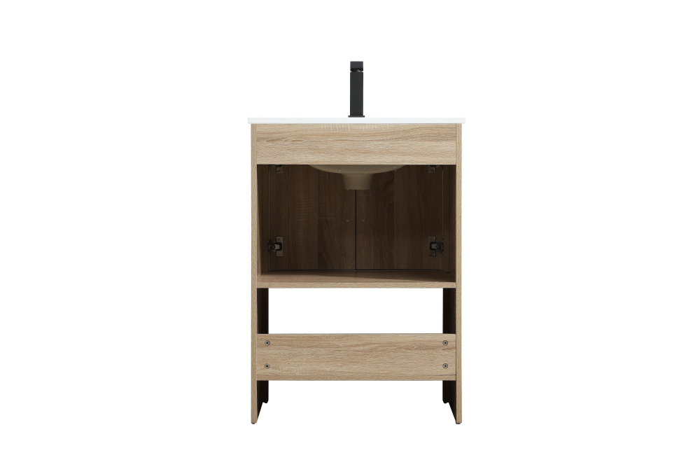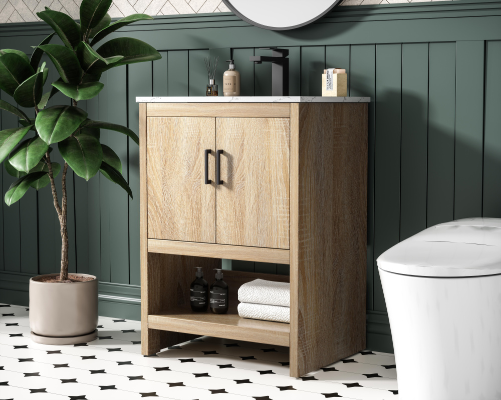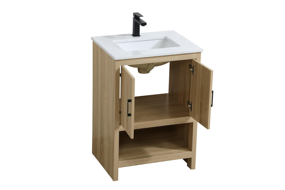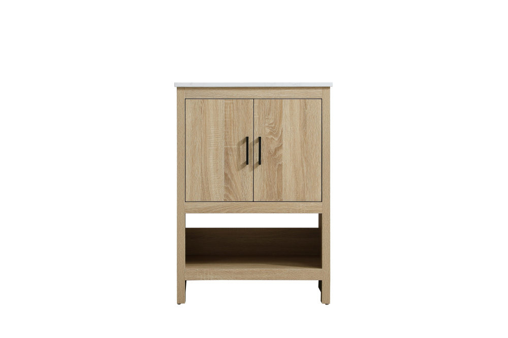 Bring modern style and practicality to your bathroom with this sleek vanity, designed to complement contemporary spaces. The flat-panel doors create a clean, minimalist look, while the open bottom shelf provides functional storage or a space to display decorative items. The engineered marble countertop showcases unique faux marbling, adding a refined and distinct touch to the design. The durable porcelain sink is easy to maintain, and the single pre-drilled faucet hole simplifies the installation process. Constructed from high-quality MDF with a versatile woodgrain finish, this vanity combines durability with timeless style. With adjustable foot levelers for stability on uneven floors and a fully assembled design, this piece offers a seamless addition to your bathroom.