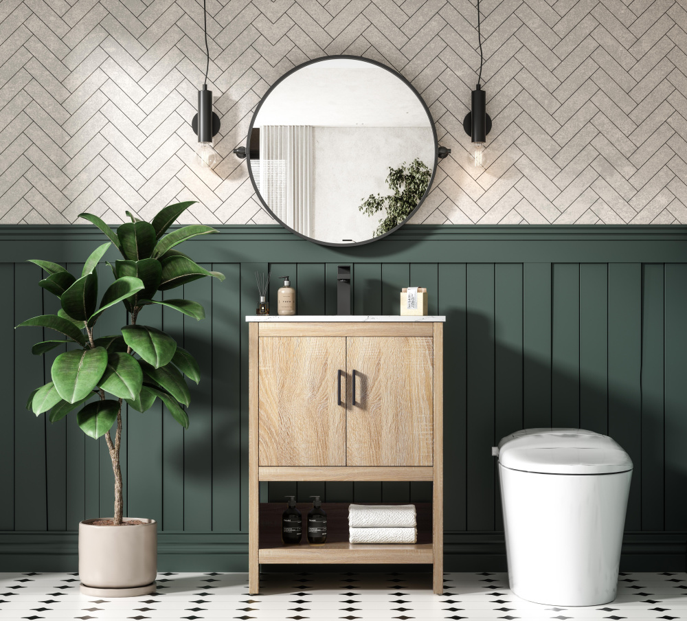 A natural wood-inspired finish adds warmth and texture to your bathroom.