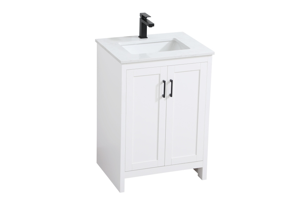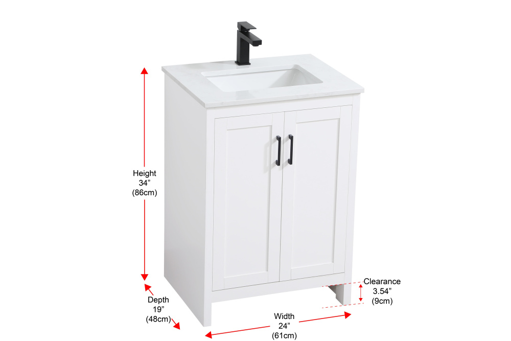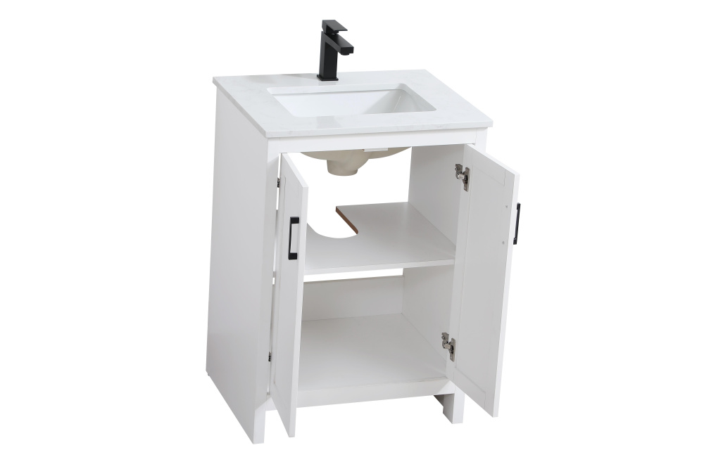 Redefine your bathroom with this transitional shaker-style vanity, designed to combine practicality with timeless aesthetics. Its clean lines and shaker-style door panels create a versatile look that complements both traditional and contemporary spaces. The engineered marble countertop, featuring a unique faux marbled pattern, adds a sophisticated focal point, while the integrated porcelain sink ensures durability and easy maintenance. The vanity includes a shelf with a smart U-shaped cutout, optimizing storage while accommodating plumbing. Crafted from sturdy MDF with a white finish, it brings a clean and inviting feel to your bathroom. Equipped with adjustable foot levelers for stability and a pre-drilled faucet hole for quick installation, this compact vanity delivers on both style and function. Best of all, it arrives fully assembled, ready to enhance your space right out of the box.