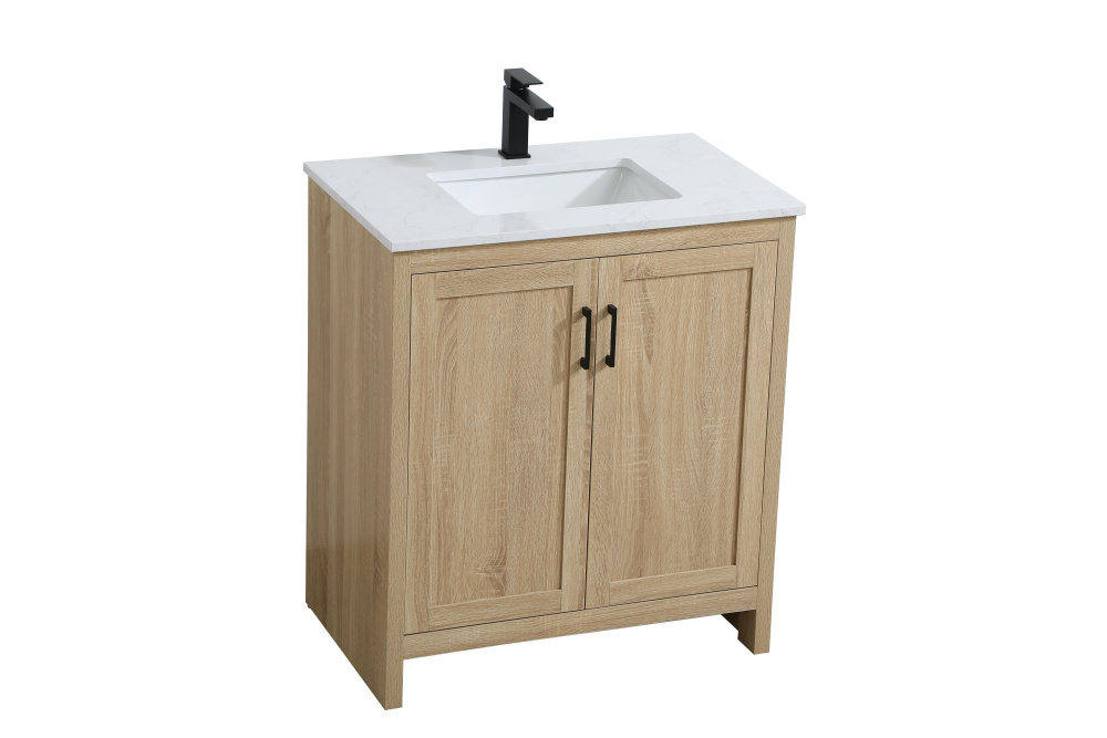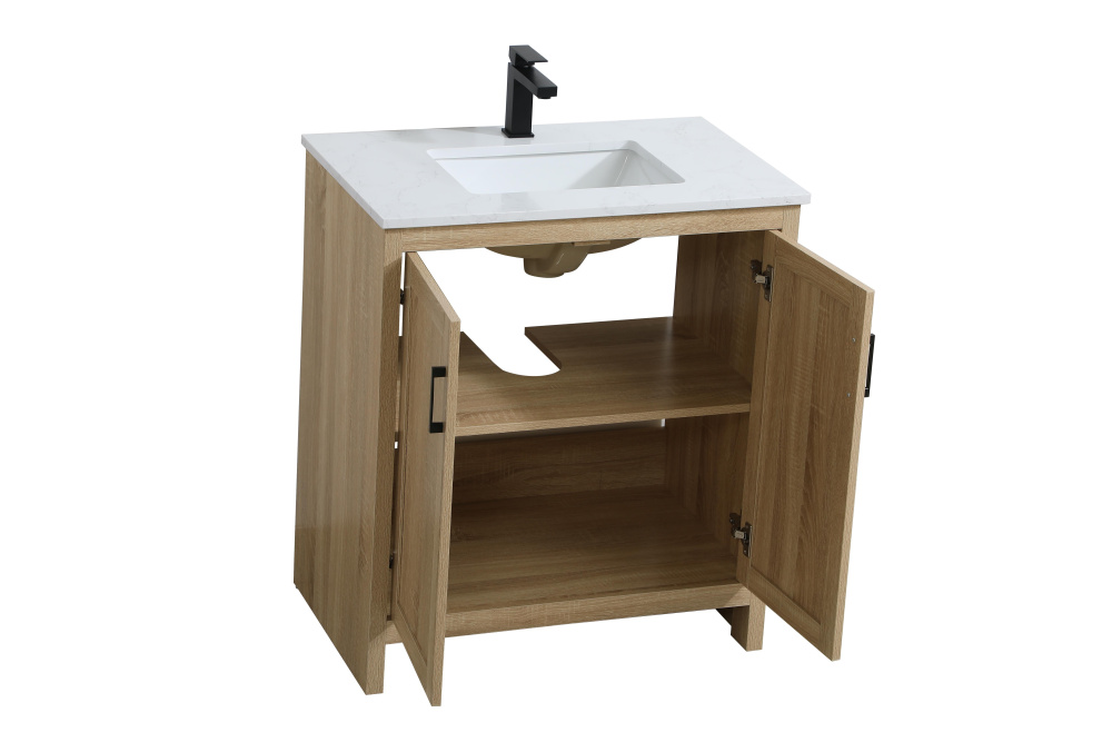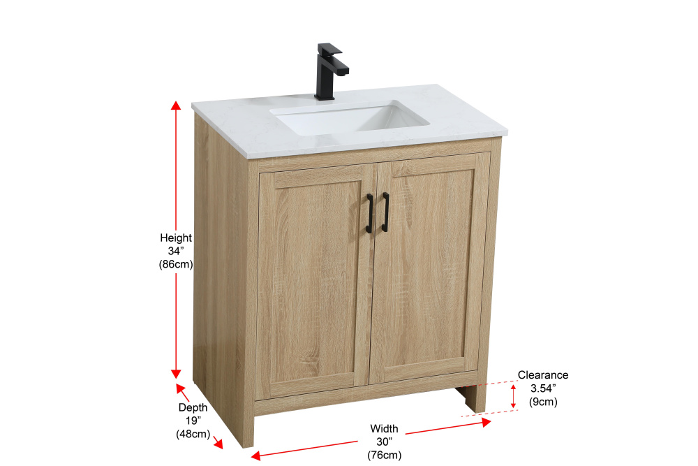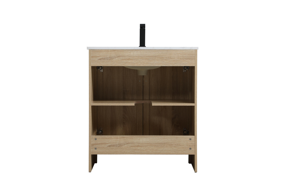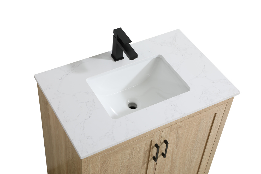 Redefine your bathroom with this transitional shaker-style vanity, designed to combine practicality with timeless aesthetics. Its clean lines and shaker-style door panels create a versatile look that complements both traditional and contemporary spaces. The engineered marble countertop, featuring a unique faux marbled pattern, adds a sophisticated focal point, while the integrated porcelain sink ensures durability and easy maintenance. The vanity includes a shelf with a smart U-shaped cutout, optimizing storage while accommodating plumbing. Crafted from sturdy MDF with a warm woodgrain finish, it brings a natural and inviting feel to your bathroom. Equipped with adjustable foot levelers for stability and a pre-drilled faucet hole for quick installation, this compact vanity delivers on both style and function. Best of all, it arrives fully assembled, ready to enhance your space right out of the box.